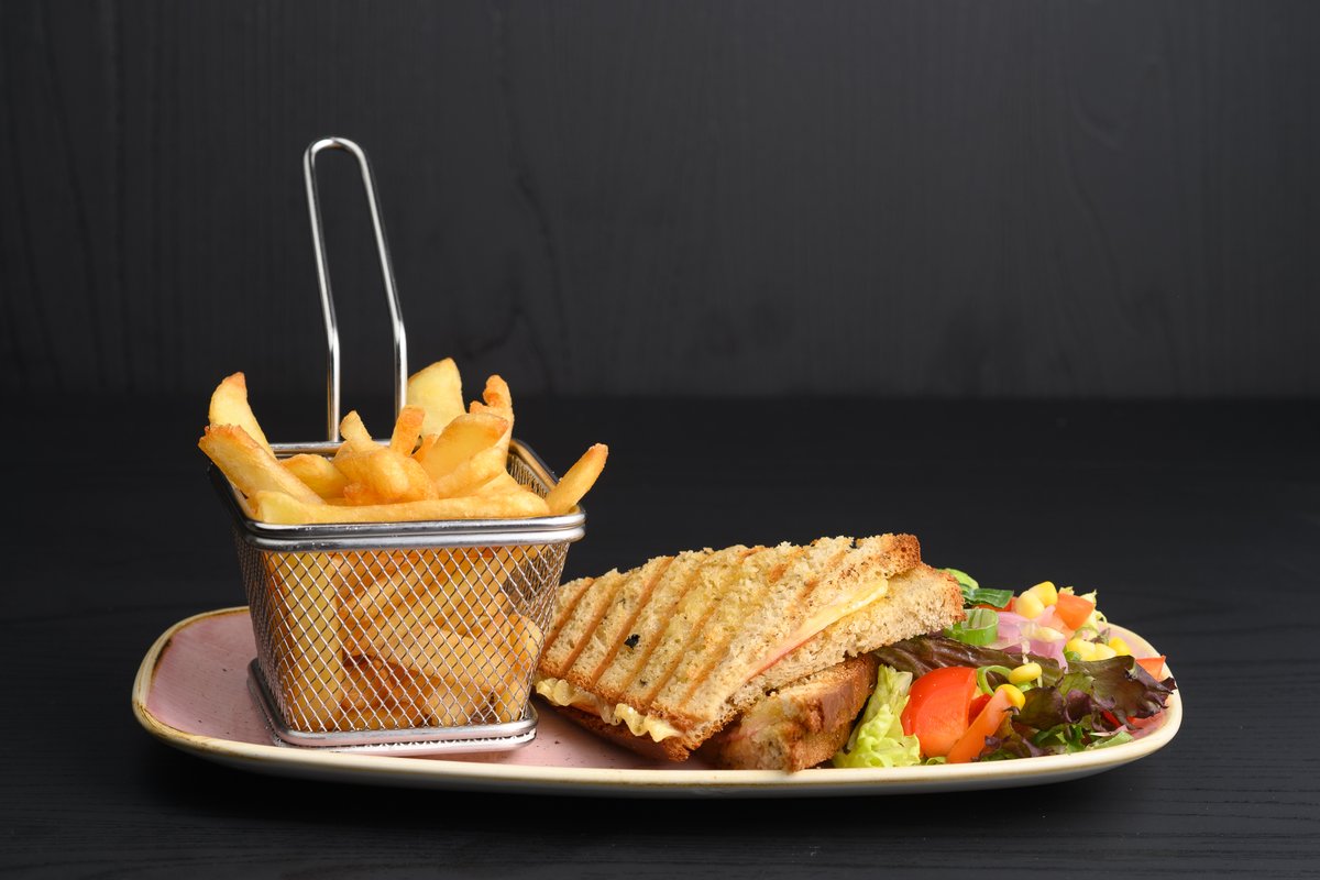 Ost og skinke toast på hjemmelaget brød, serveres med sidesalat og pommes. Inkludert valgfri 0,5 mineralvann.