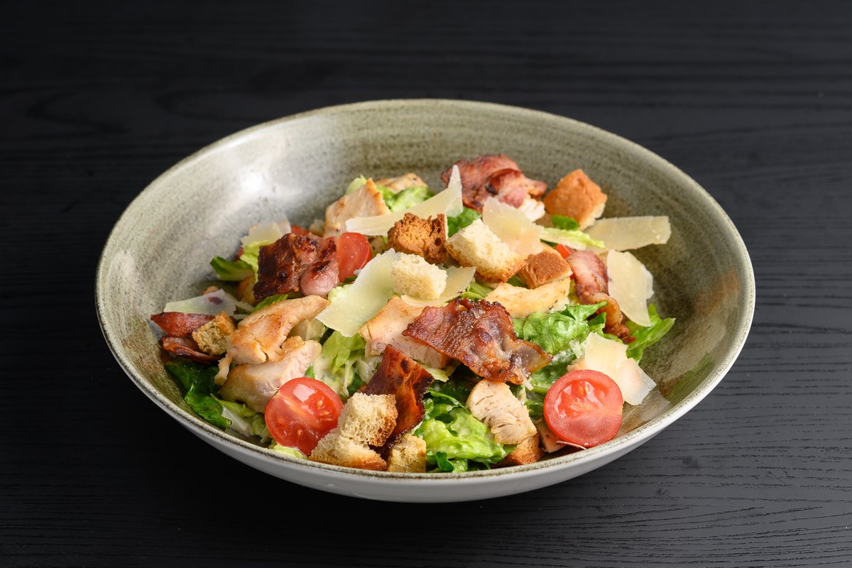 Reven romano salat med cesardressing toppes med kyllingbiter, bacon biter, cherrytomater, parmesan og husets krutonger.