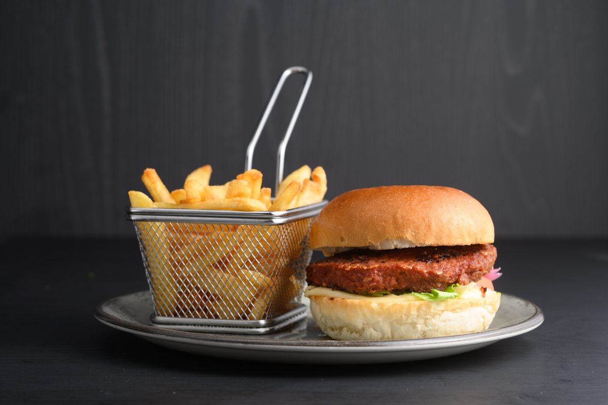 Burger laget av kikerter. Serveres med salat, tomat, syltet rødløk og aioli. Pommes frites og aioli på siden.