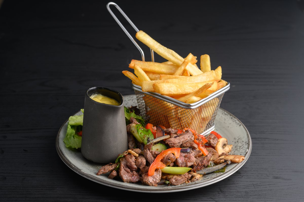 150g biff strimler, stekt sjampinjong, rødløk og paprika. Serveres med en sidesalat, pommes frites og bearnaise.