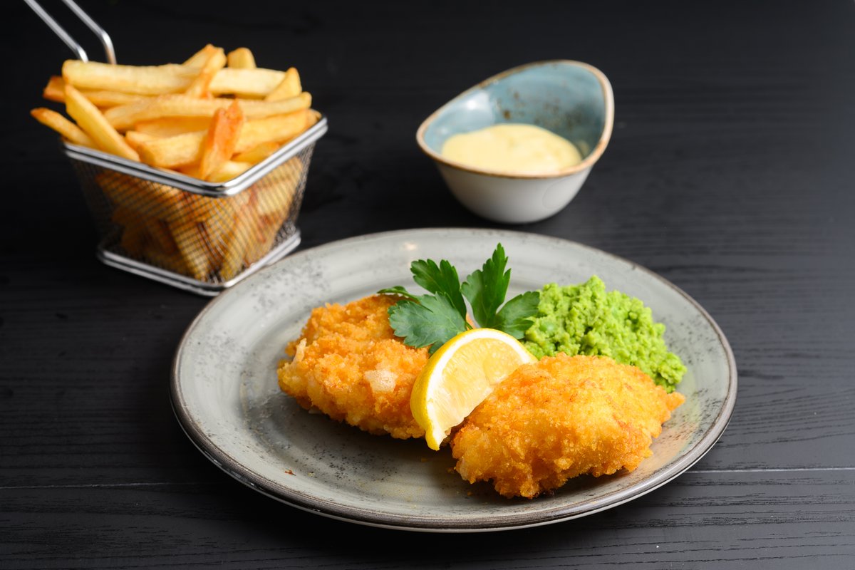 Panert torskefilet, servert med pommes frites, ertepuré, salat og sitron.