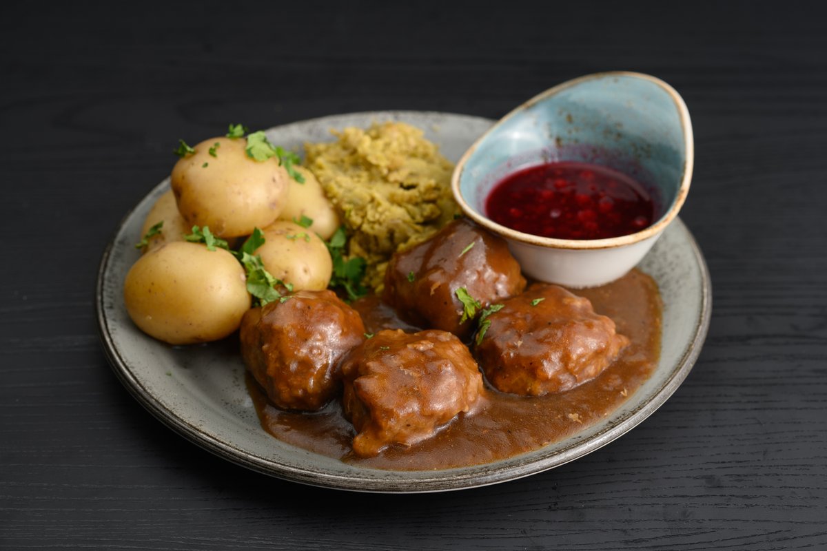 Hjemmelagede kjøttkaker på storfe kjøtt, med ertestuing, poteter, gulrot og tyttebær.