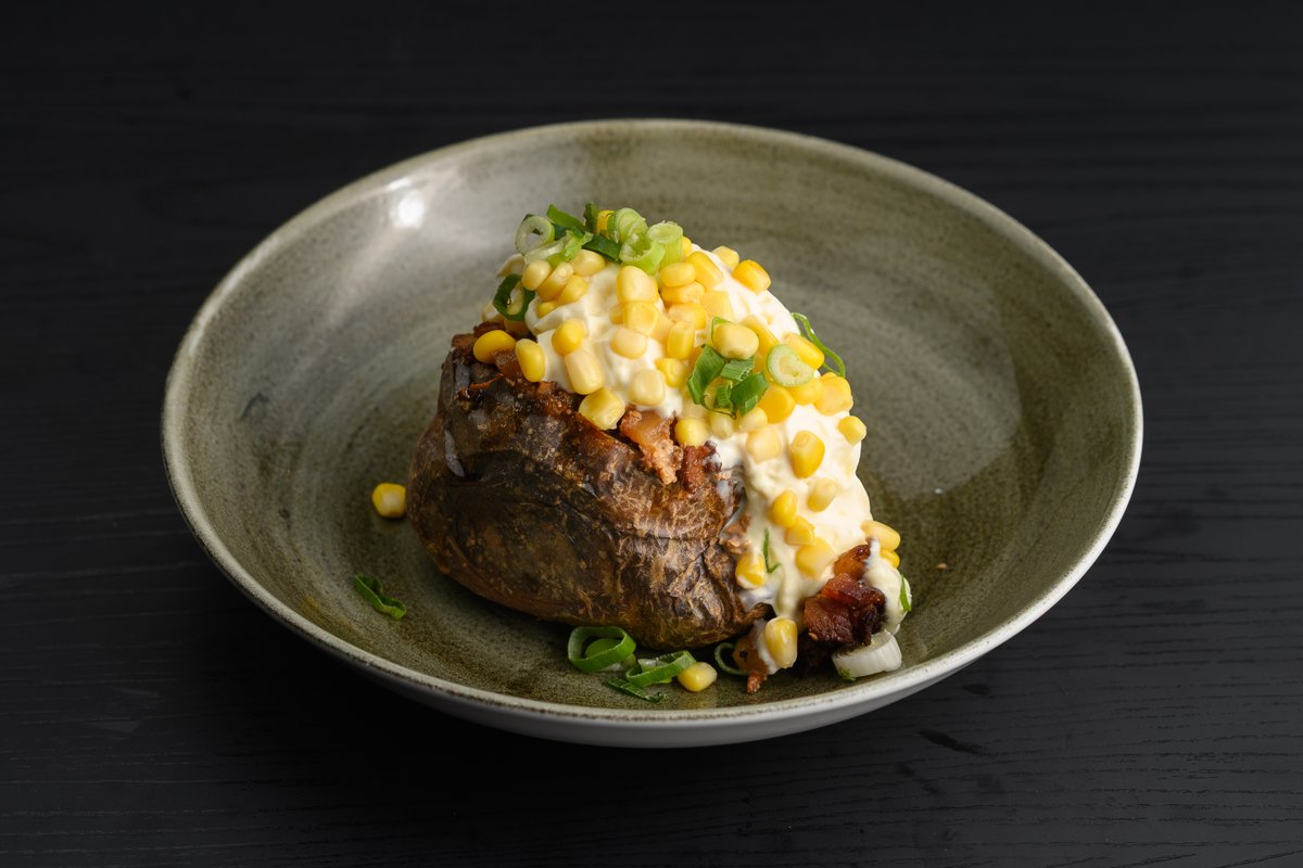 Potet servert med baconterninger, purreløk, smør og mais. Toppes med rørosrømme.