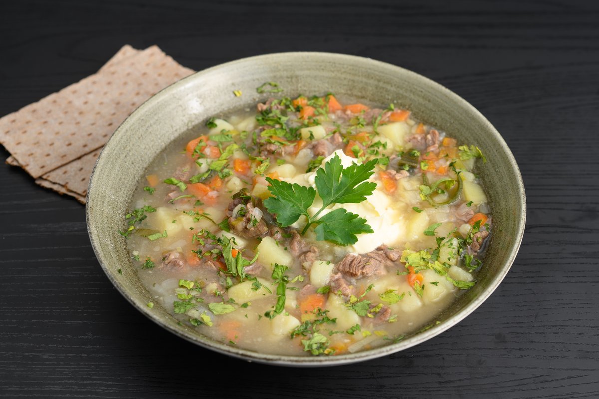 Fyldig oksekjøttsuppe, med rustikke biter av rotfrukter. Toppes med rørosrømme.
