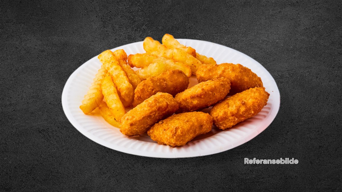 5 kylling nuggets servert med pommes.