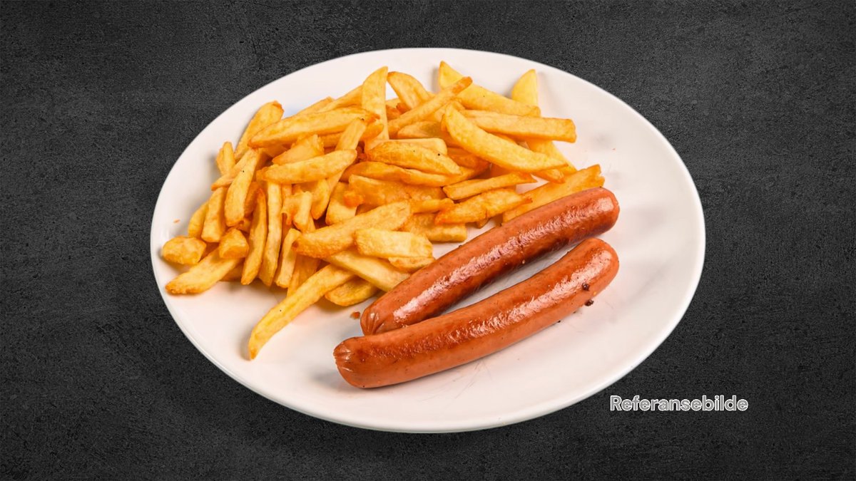 Grillpølse servert med pommes.