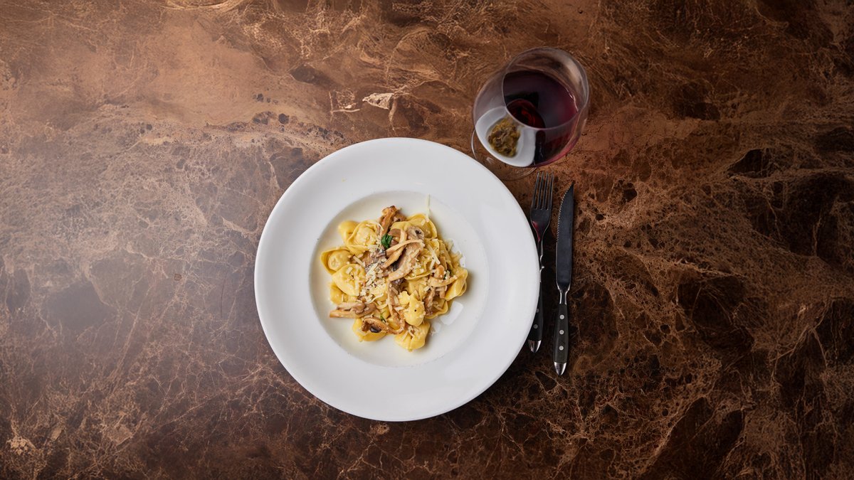 tortellini fylt med ricotta og steinsopp, vendt i en rik parmesan- og smørsaus. Toppet med smørstekt sopp