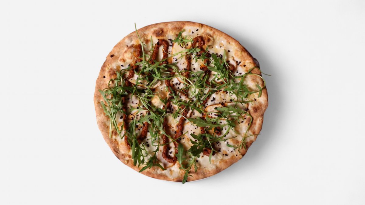Pizza med mozzarella, pecorino, kylling, chilipaste, ruccola og sitron Sterk!