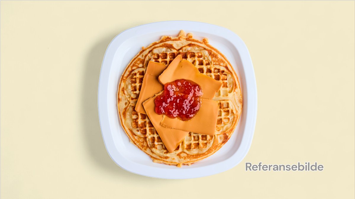 Hjemmelaget vaffel med syltetøy, kremtopping og brunost.