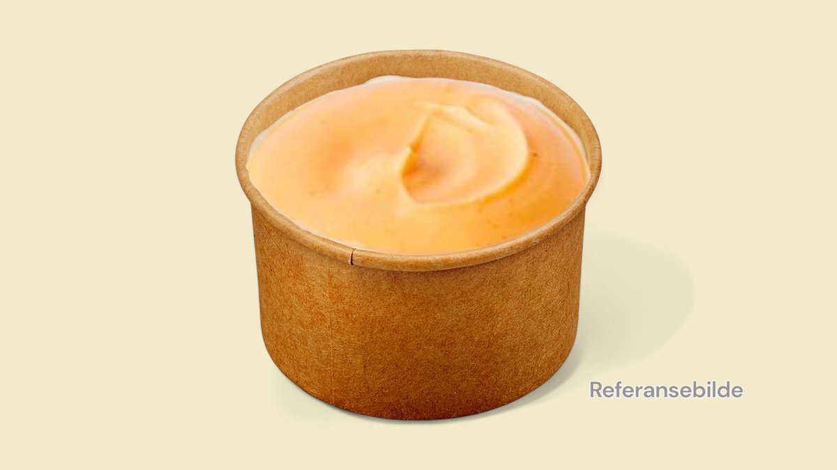 Ost, salat, løk, tomat, bbq-saus og crush-topping.