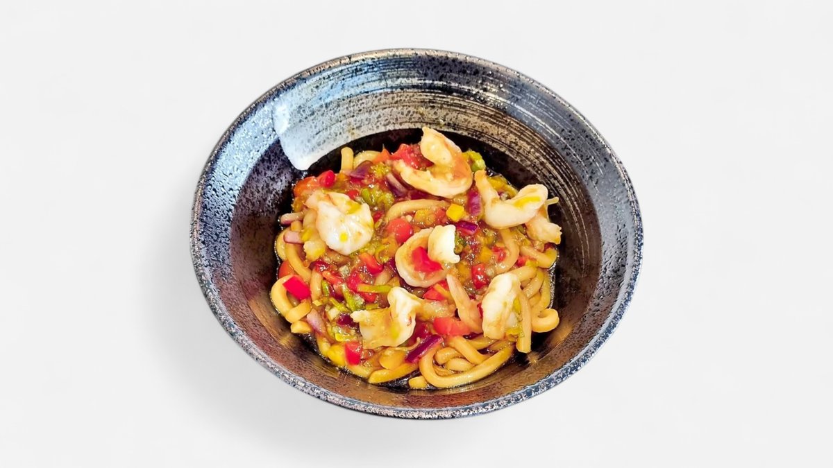 Premium Udon nudler med hviløksmarinert scampi