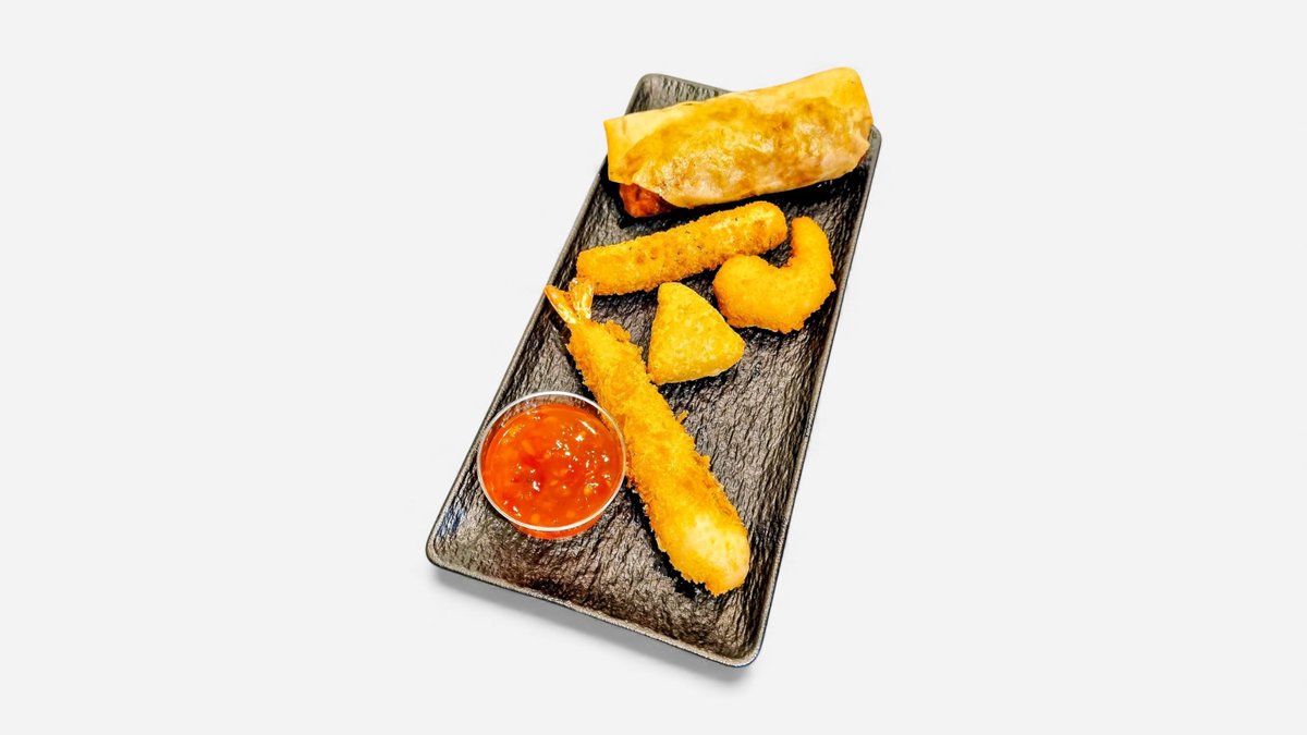 prøv litt av alt. her får du følgende: 1 stk vårrull. 1. stk mozzarella stick. 1. stk Chilli cheese. 1. stk Scampi fritti 1. stk Scampi tempura og sweet chilli saus.