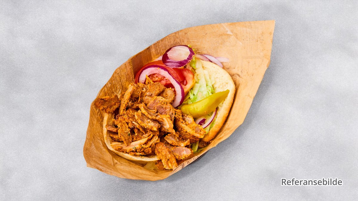 Kebab i pita med salat, tomat, løk, mais, gyroskjøtt og kebabdressing.