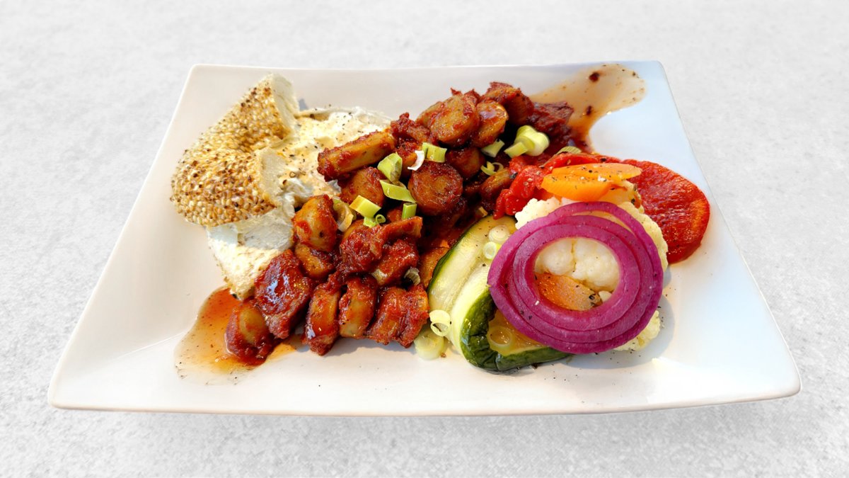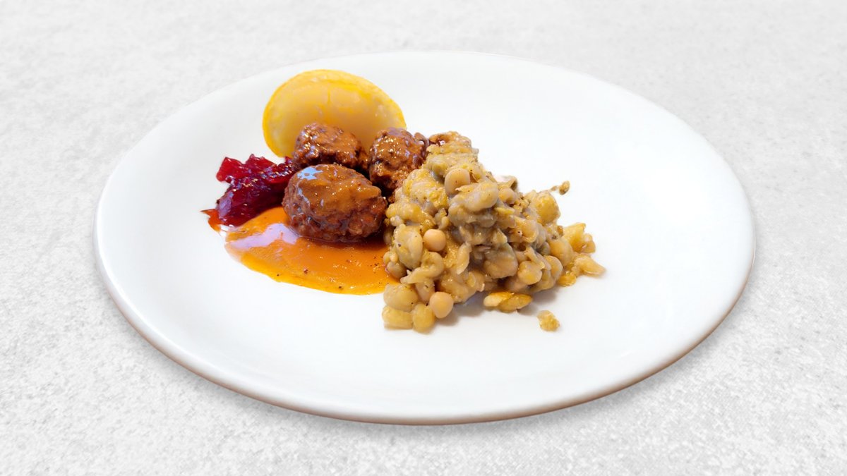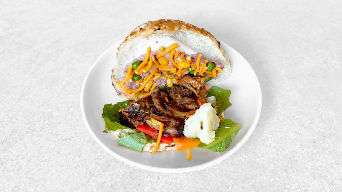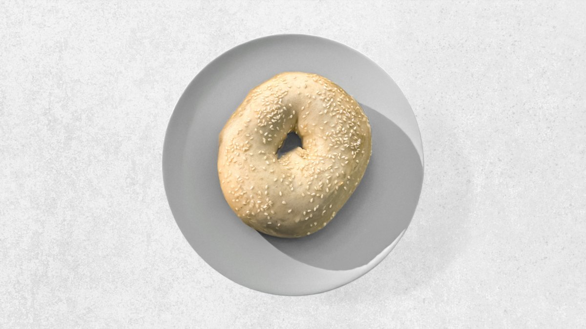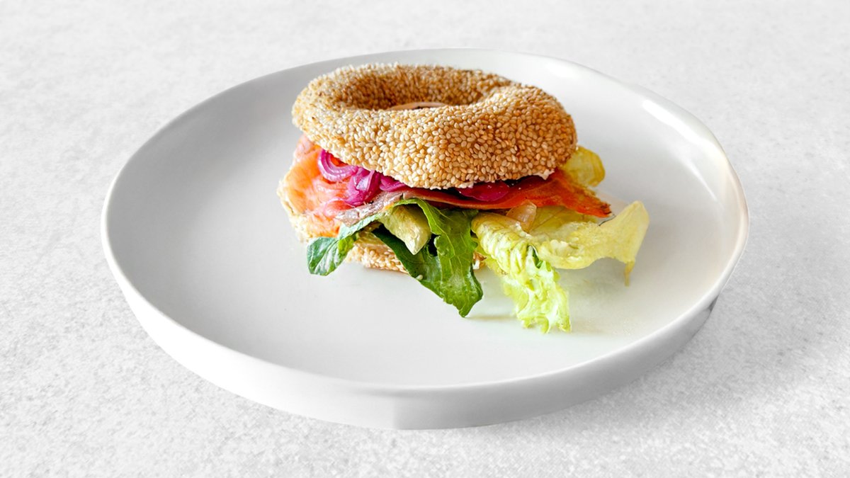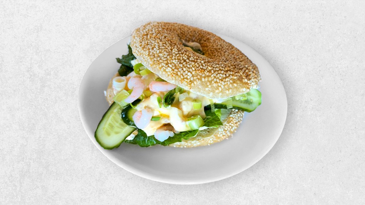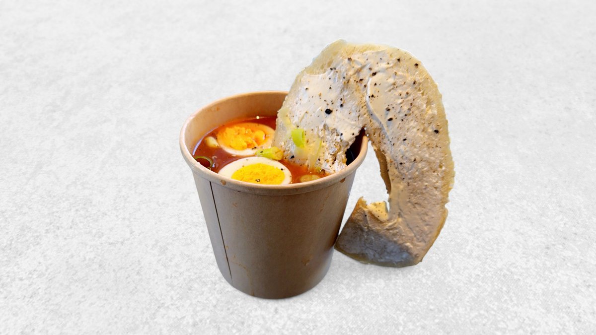 Velg om du vil ha den vegetarisk eller med egg og kjøttboller. Serveres med en halv bagel.