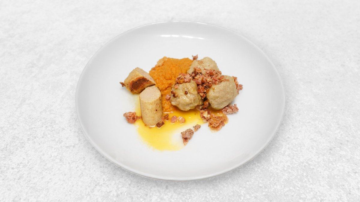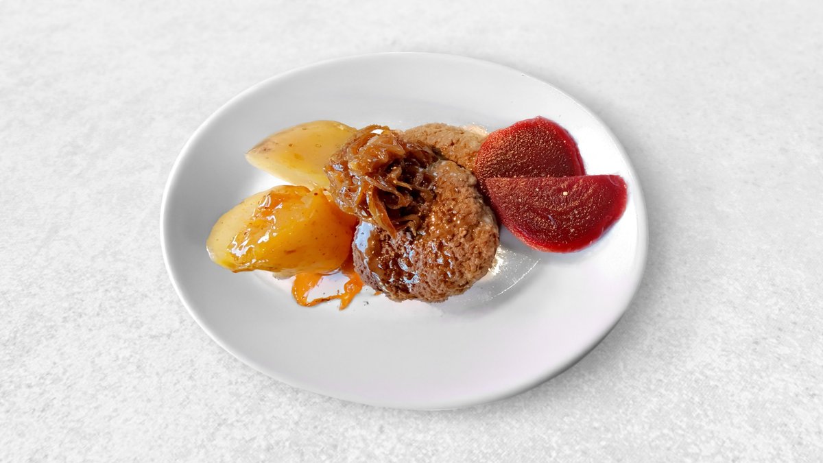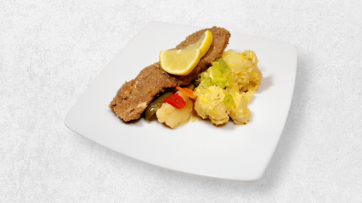 Svinesnitzel med syltede grønnsaker, kapers og potetsalat.
