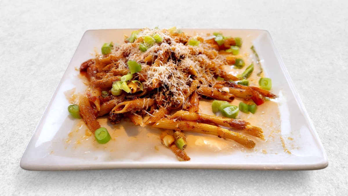 Pasta Bolognese toppet med kjøttsaus & parmesan & Bagel med kremost.