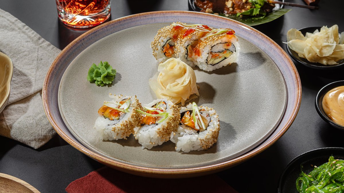 Folkefavoritten er tilbake! 6 biter maki med tempura scampi, Philadelphia og eple. Toppet med jordbær, teriyakisaus og cashewnøtter.