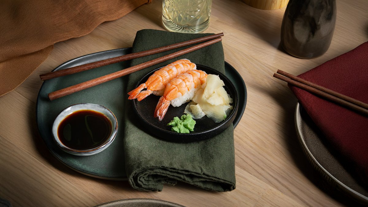 2 biter nigiri med scampi.