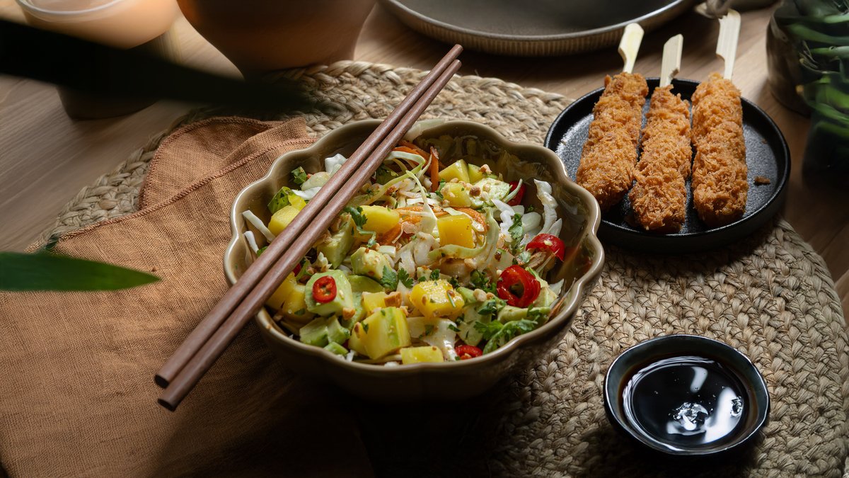 Frisk råkostsalat vendt i sweetchilli-saus med avokado og mango. Toppet med chili, koriander og cashewnøtter.