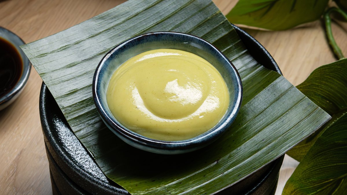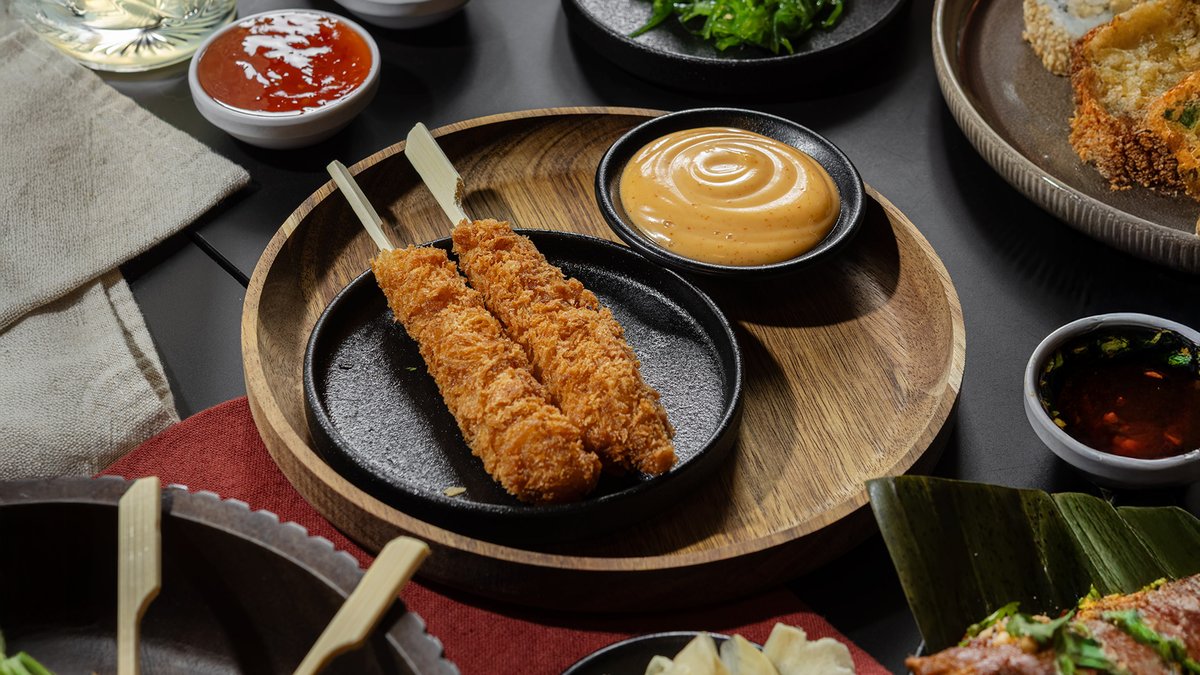 Fritert sushisandwich med grillet sataykylling, vårløk, avokado, hvit sesam og chilimajones Serveres med chilimajo og soyasaus.