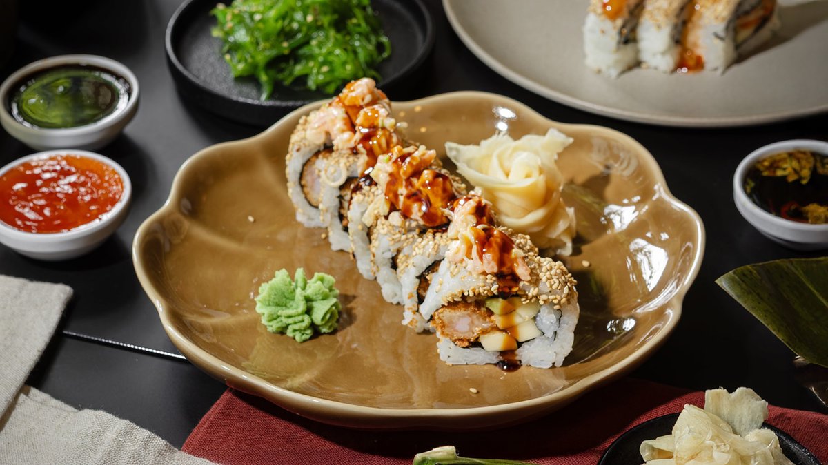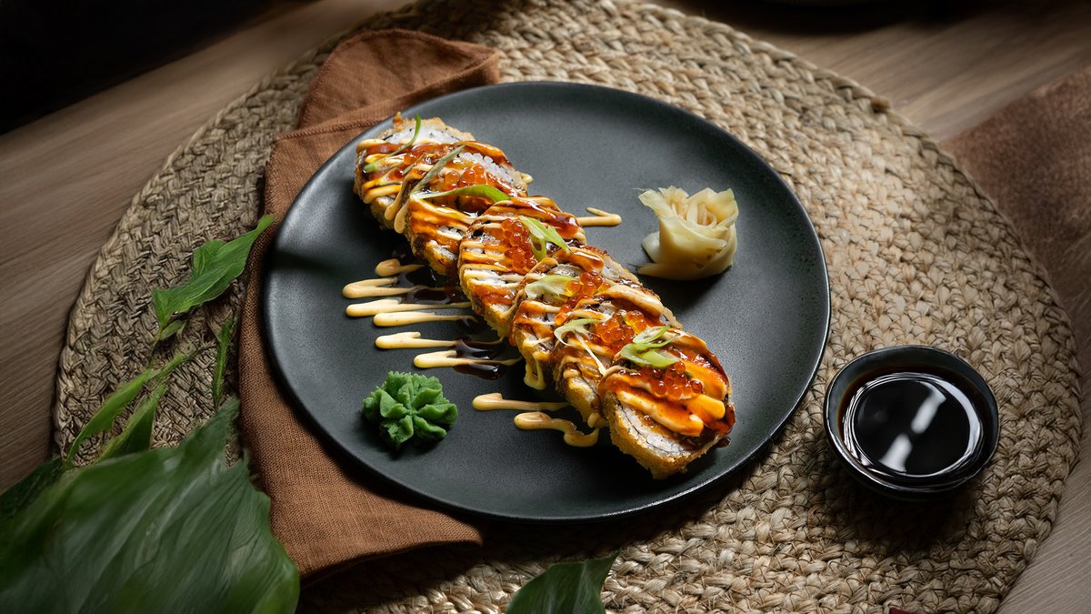 Trendretten sushiburrito med tempura scampi, Philadelphia og eple. Toppet med chilimajo, sriracha og teriyakisaus. Kommer med ekstra chilimajo til dipping!