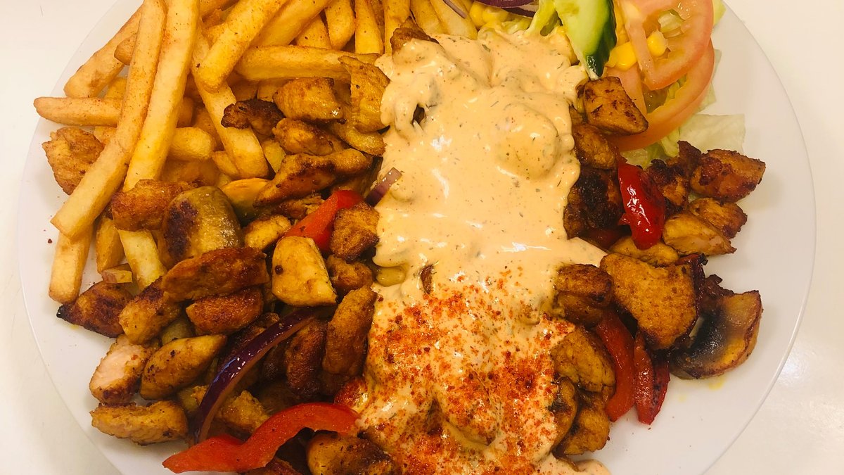 Biff, løk, champignon, paprika, chips og hvitløkssaus.