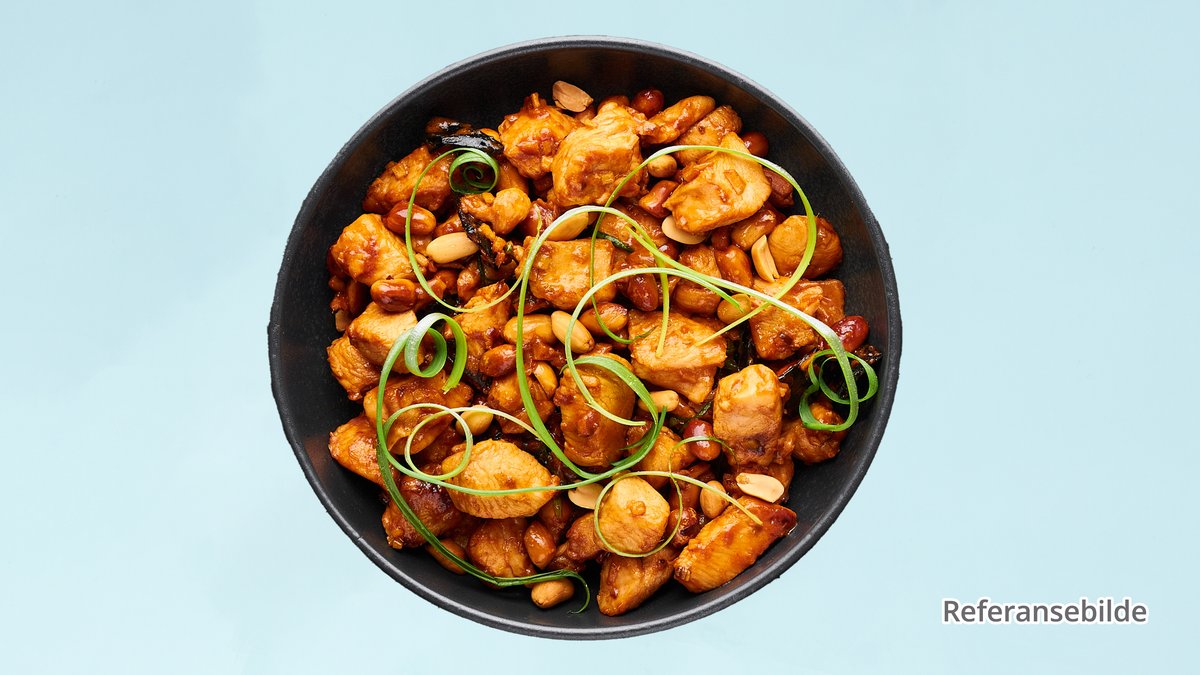 Grønnsaker og sursøt saus. Velg mellom kylling eller scampi.