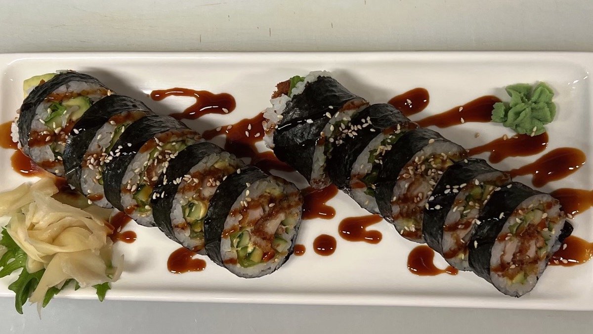 10biter fritert kylling maki, agurk, avocado, gulrot og chilli majones og teriyaki.
