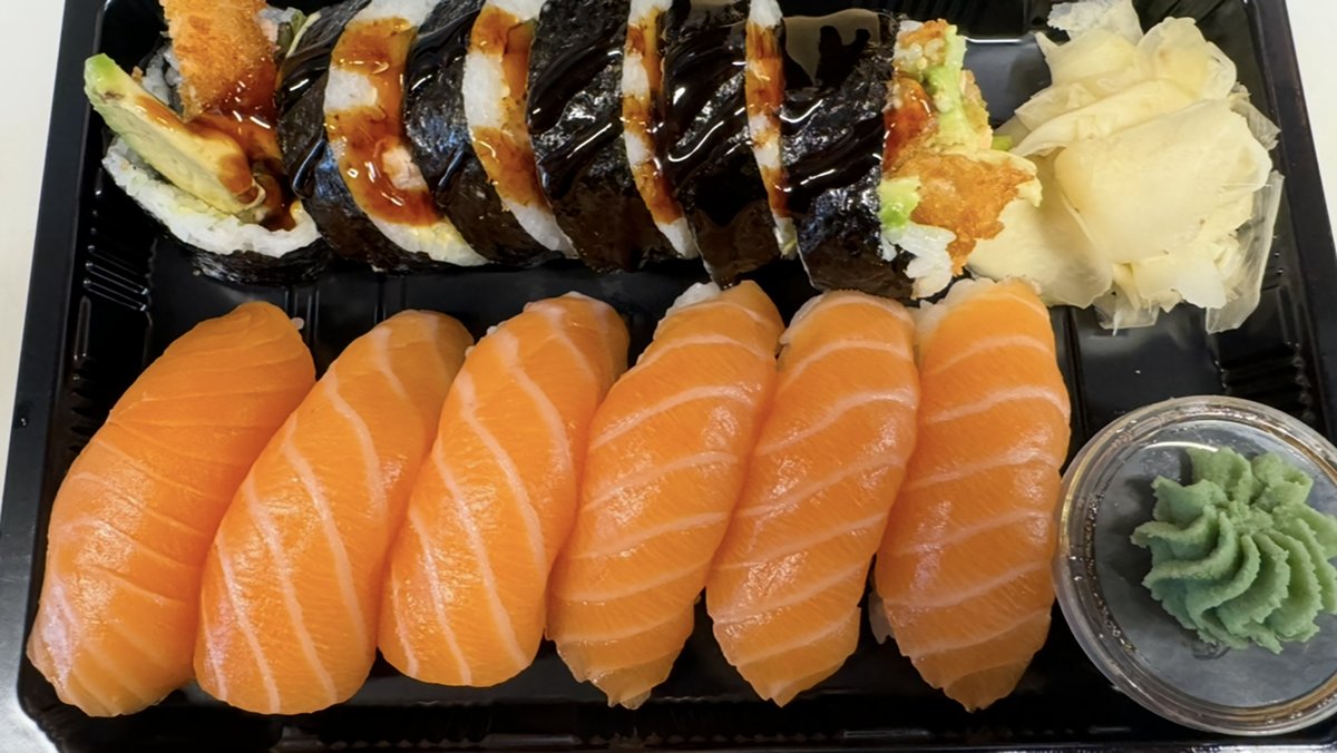 12 nigiri, 6 futomaki, 8 laks maki og 10 sashimi