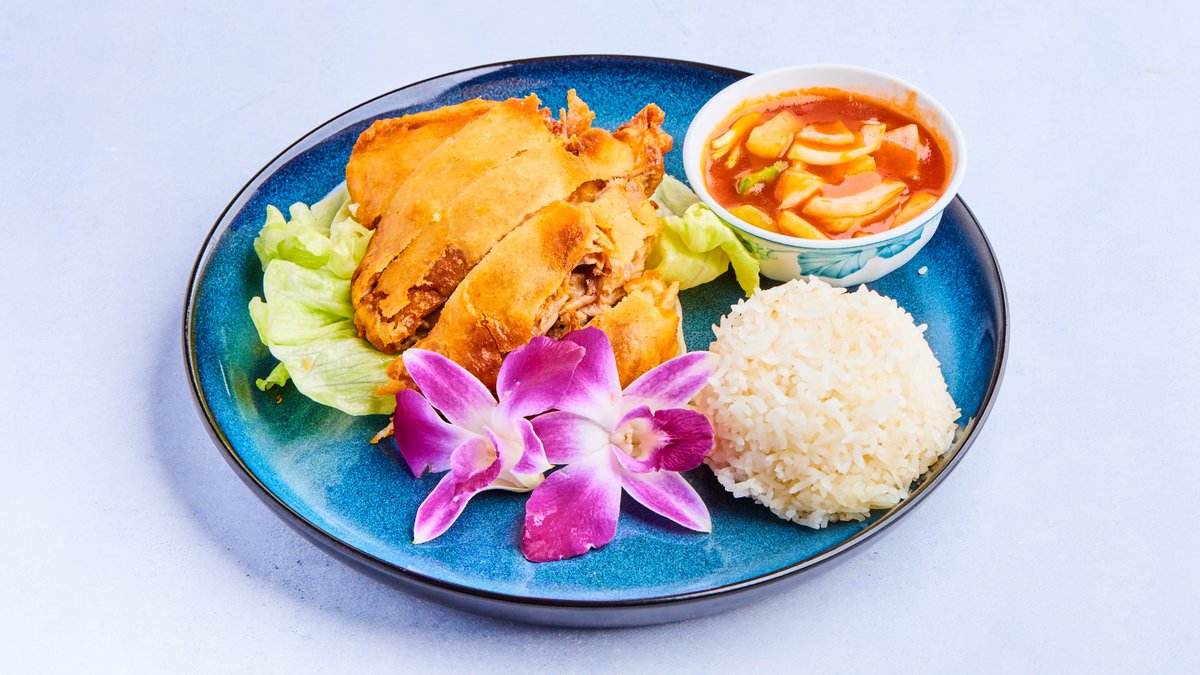 Fritert laks, tunfisk, agurk, gressløk og sweet chilisaus.