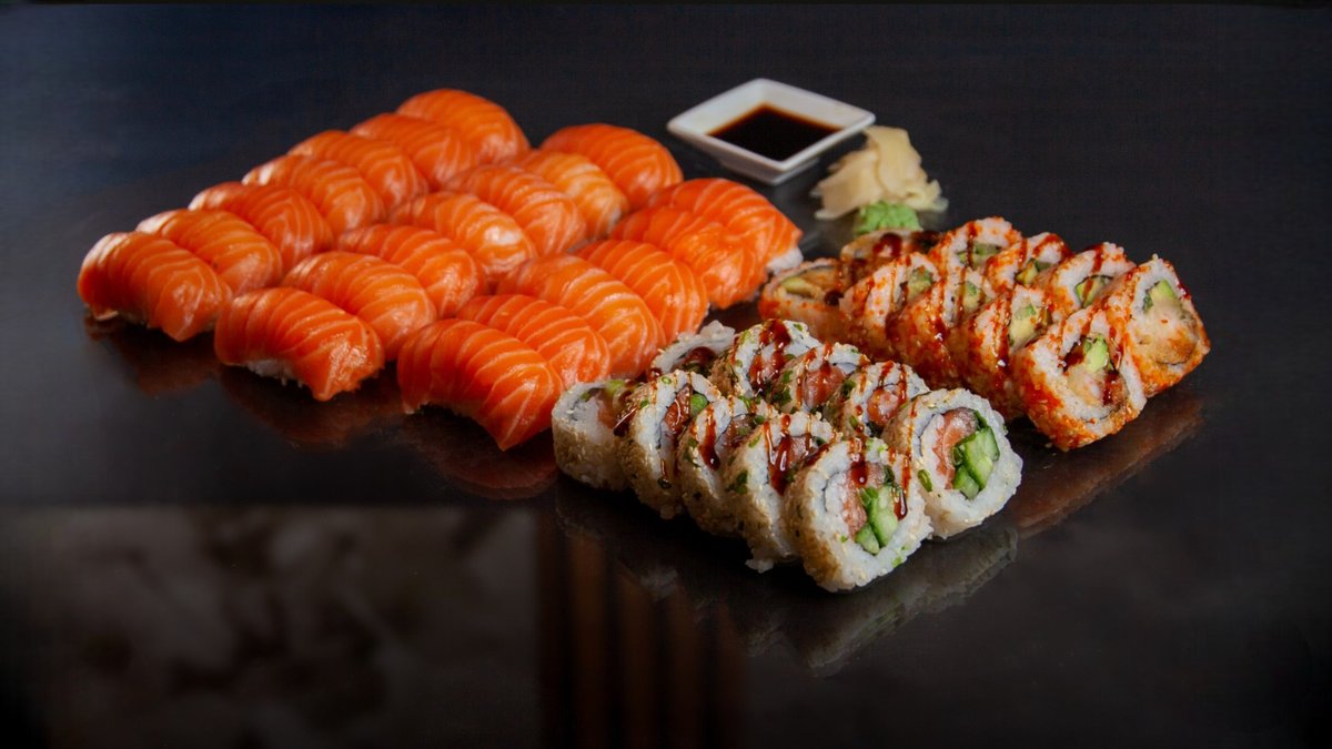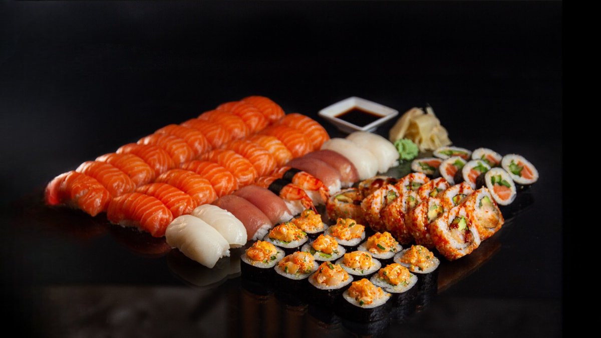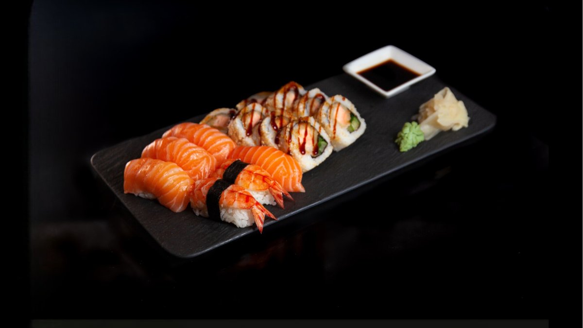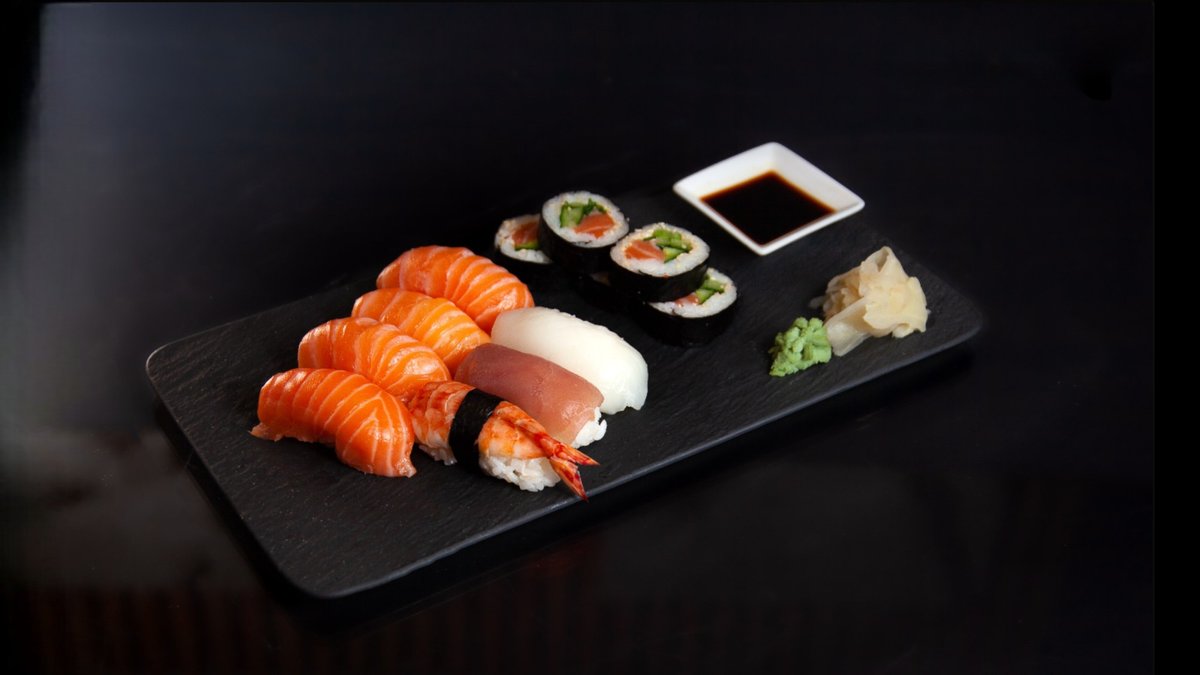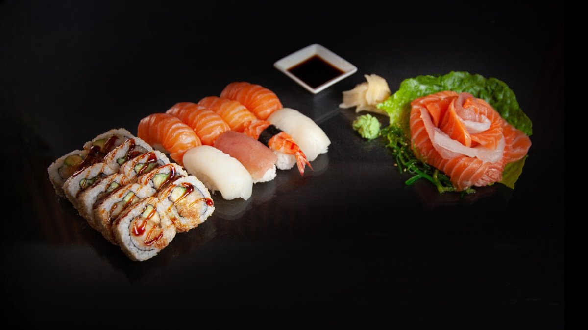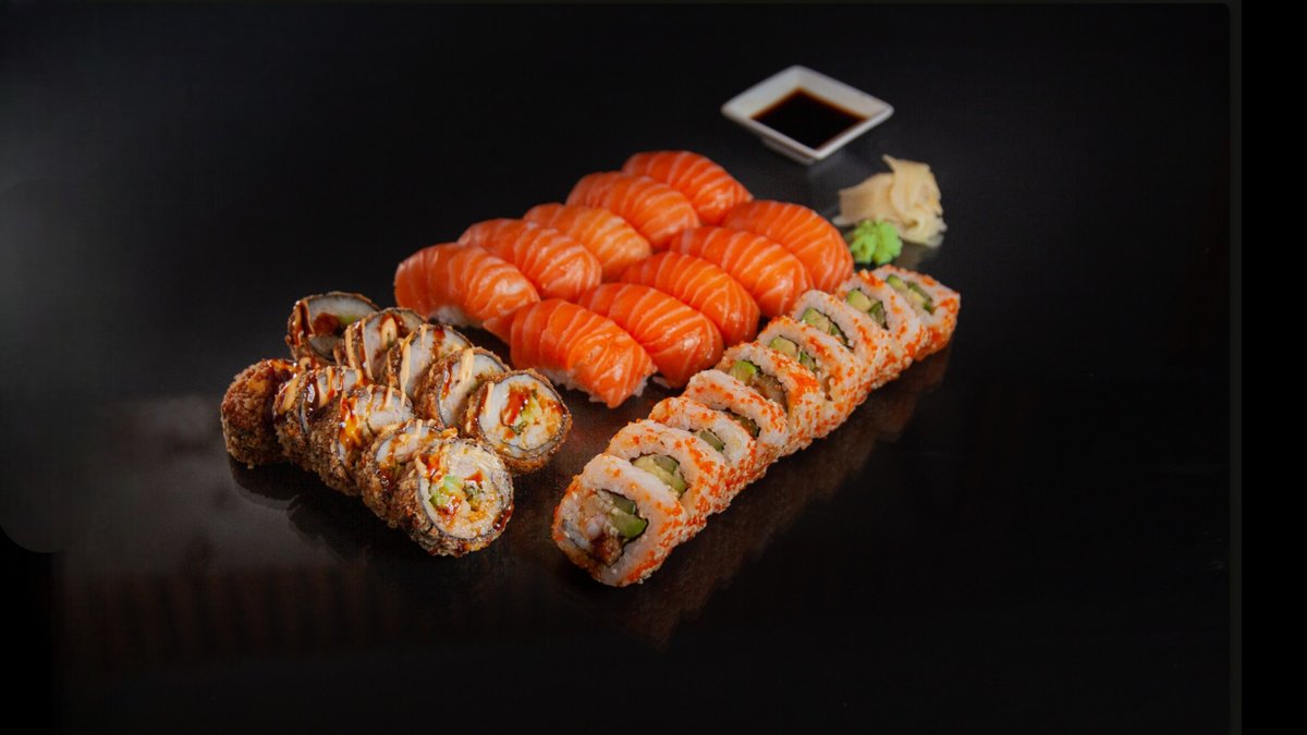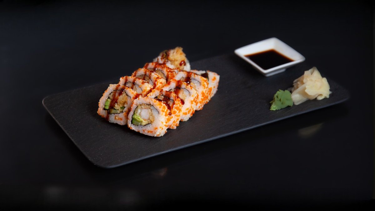 Rå laks, tempura scampi, salat, agurk, korriander, avokado, flyverogn, chilimajones og teriyakisaus.