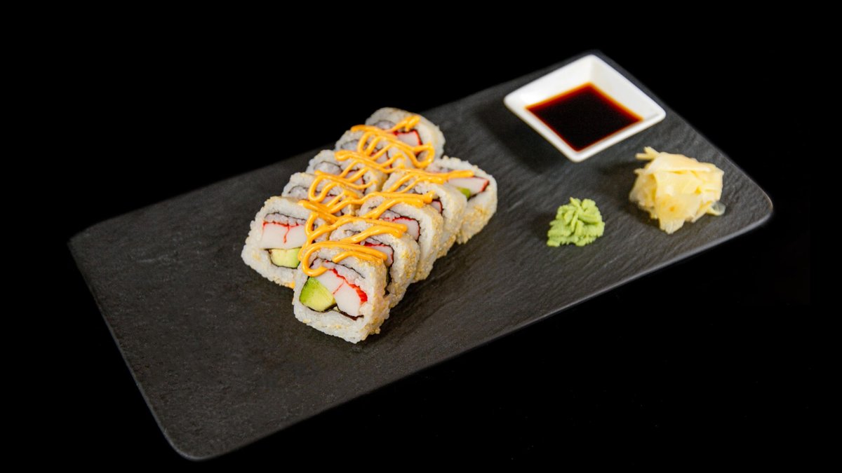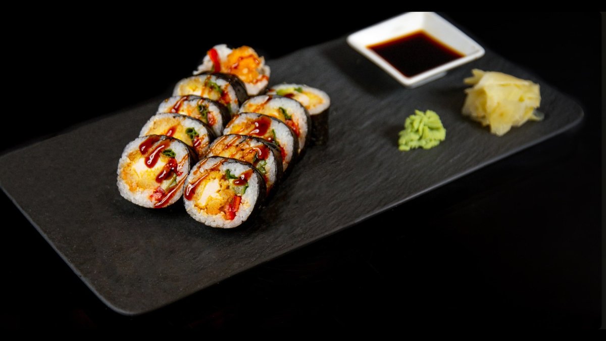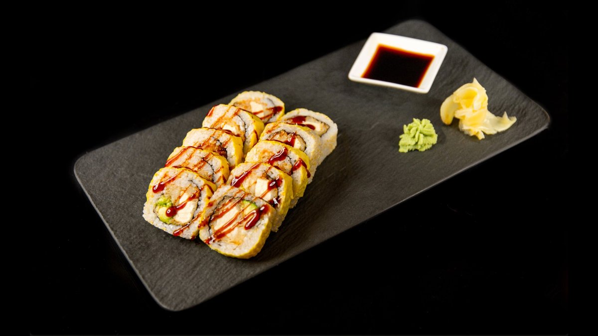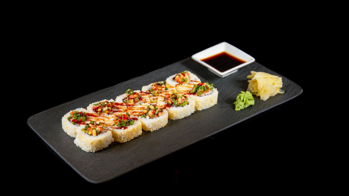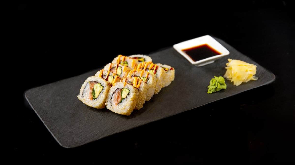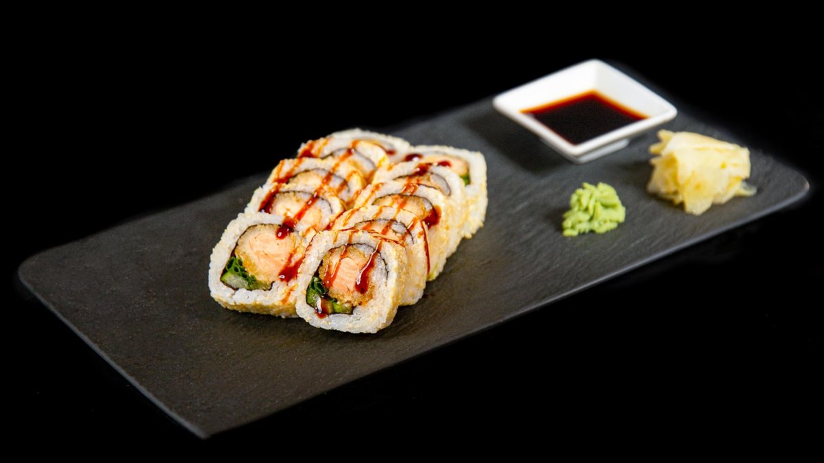 Laks, avokado, philadelphiaost, fritert scampi. Toppes med chilimajones og teriyakisaus.