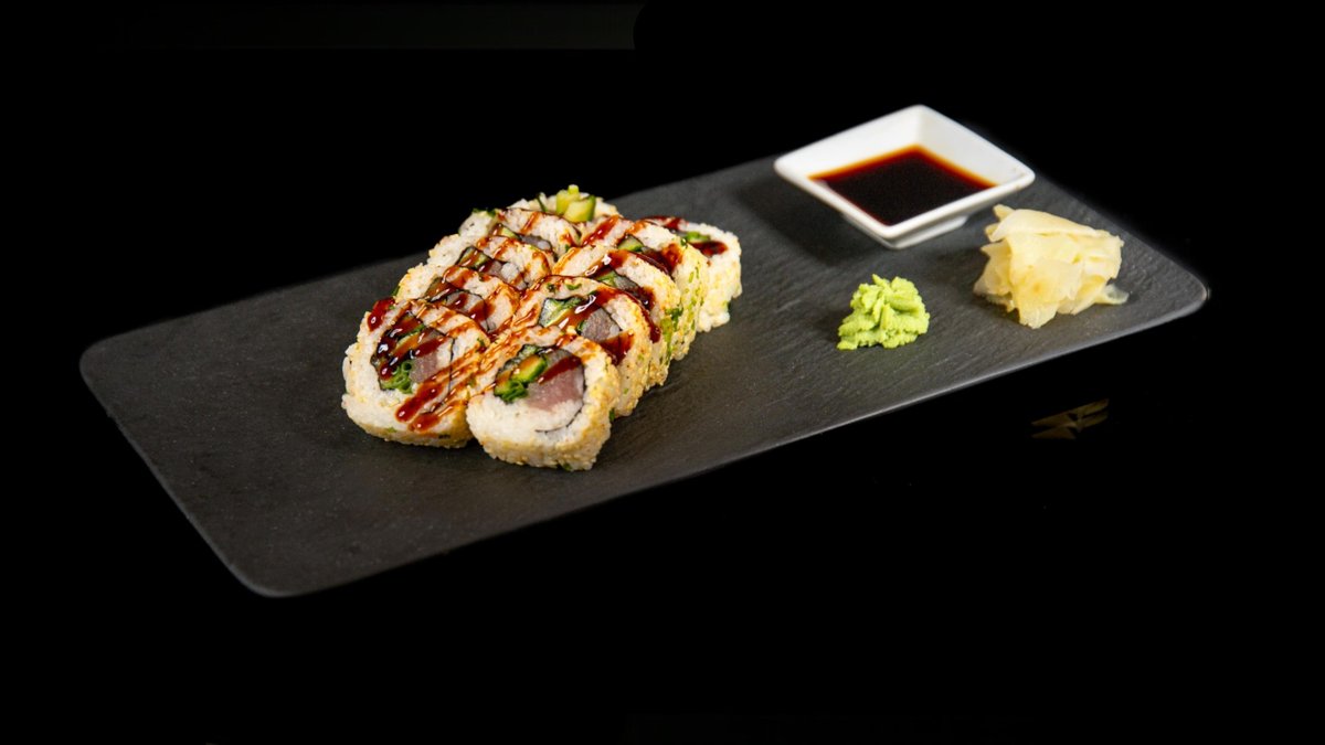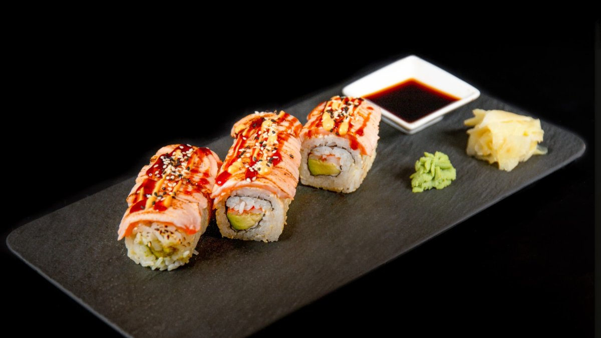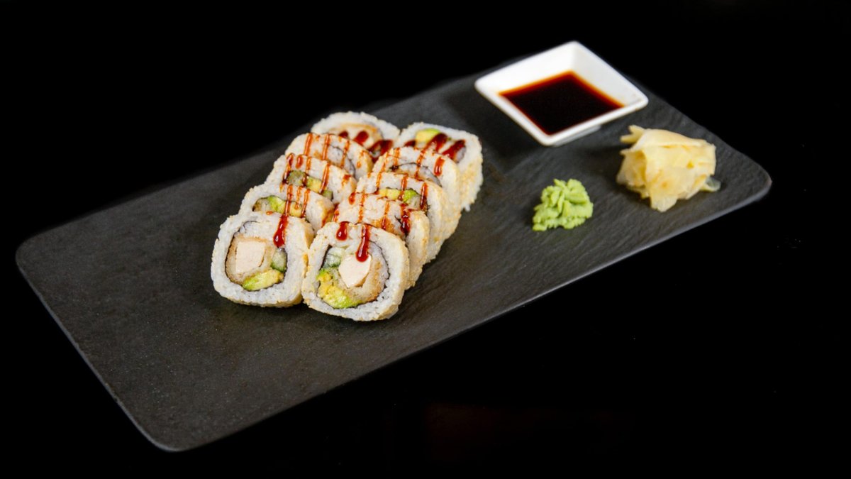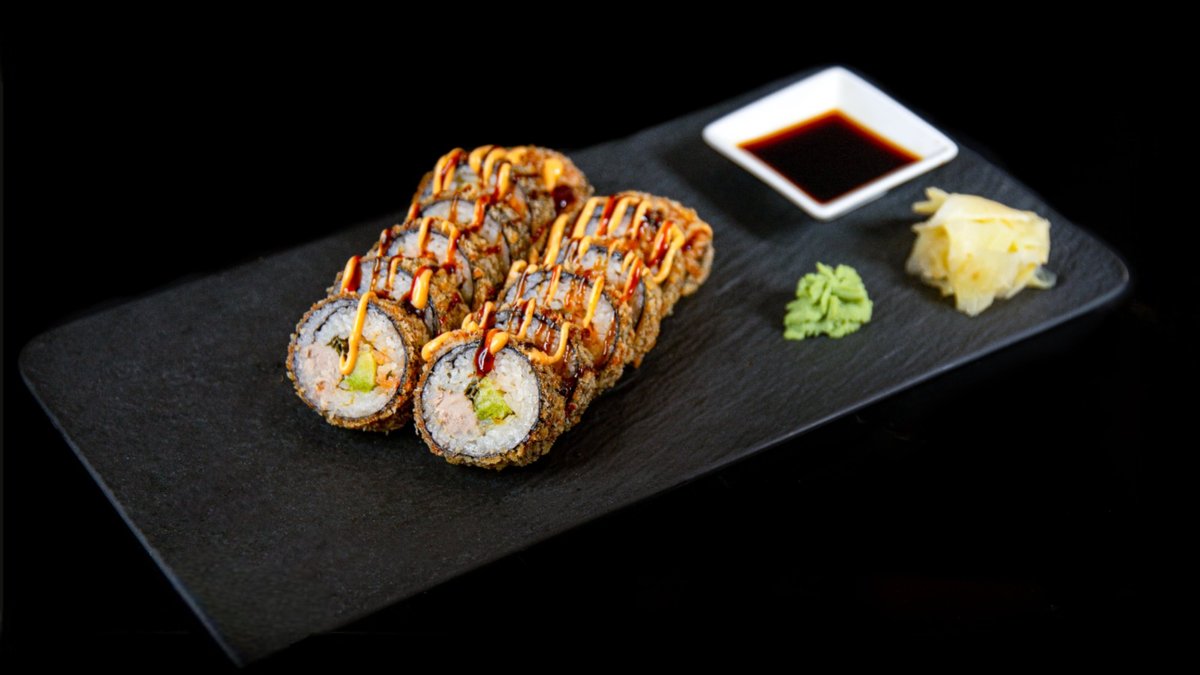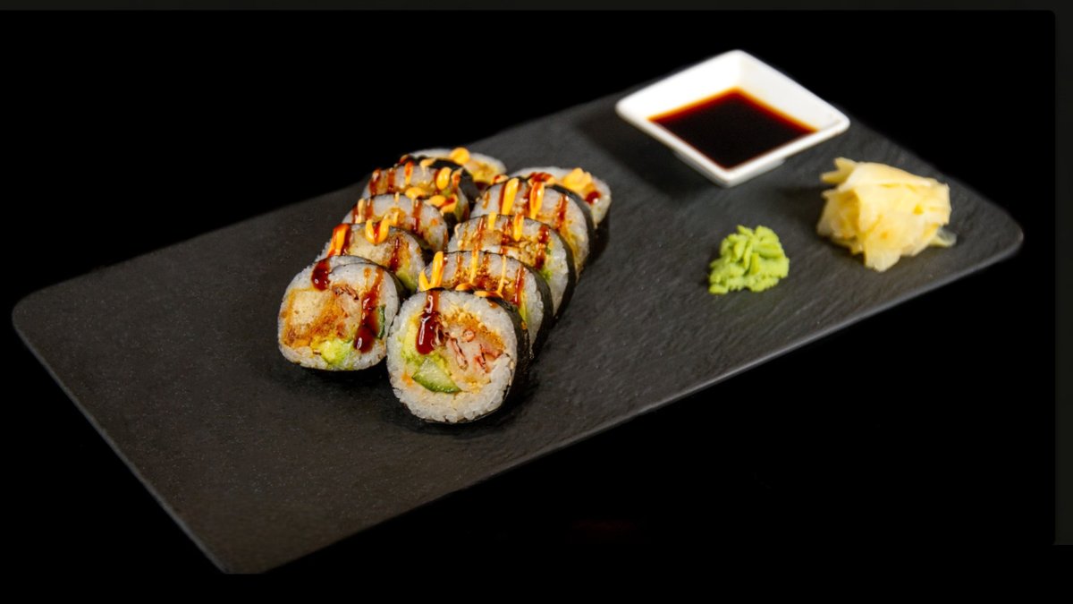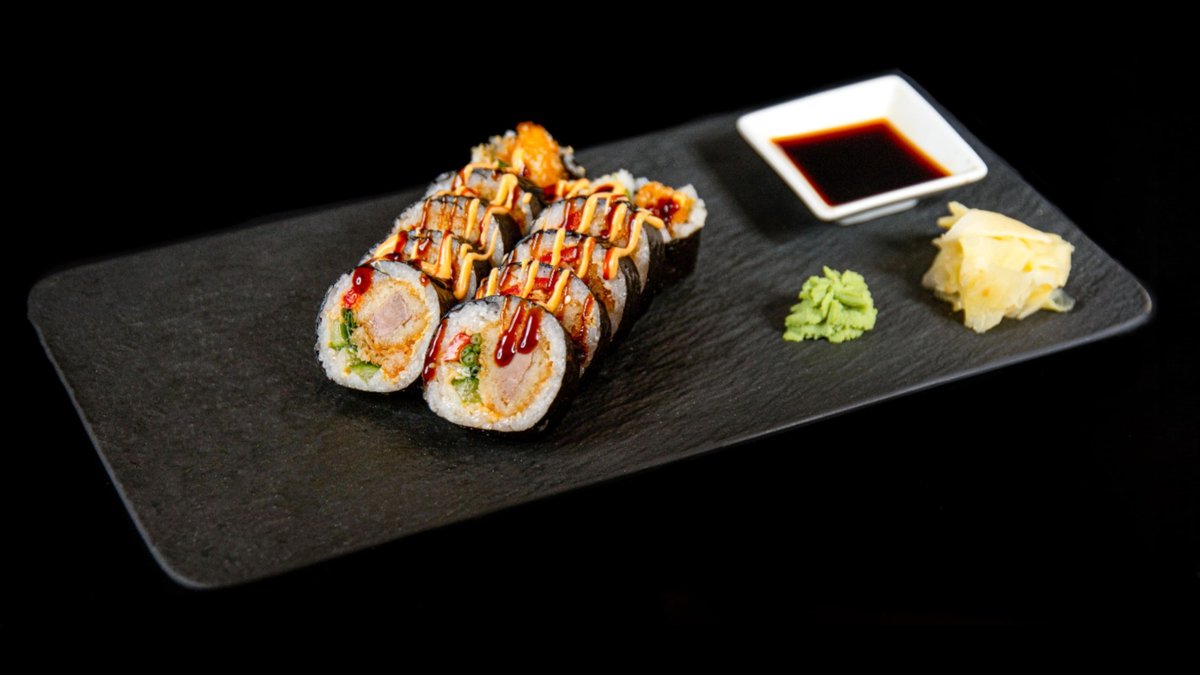 Laks, avokado, philadelphiaost, fritert scampi. Toppes med chilimajones og teriyakisaus.