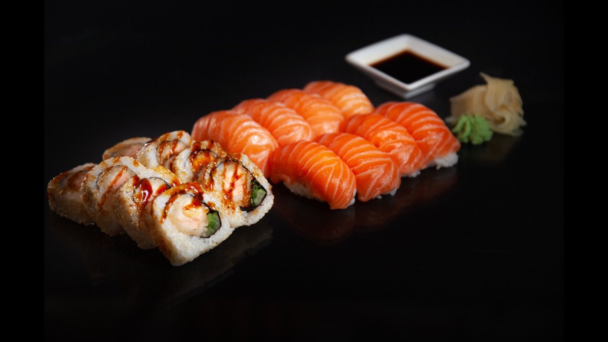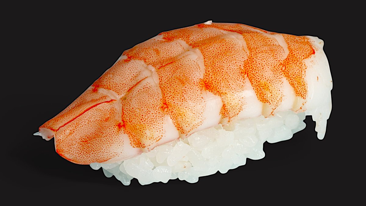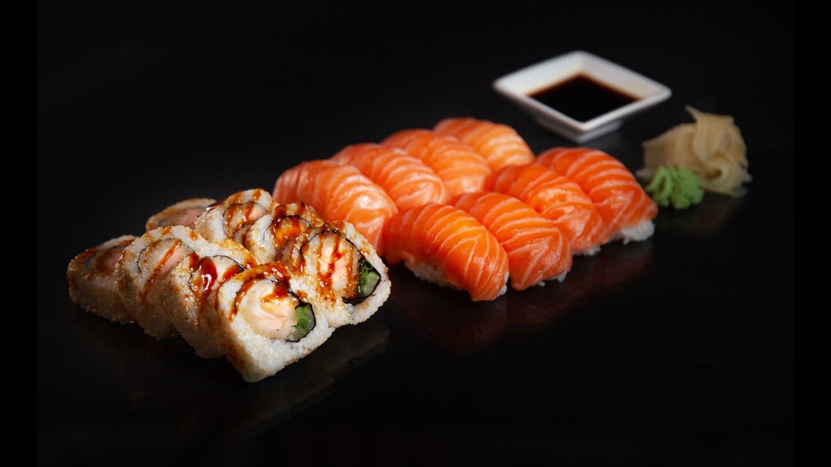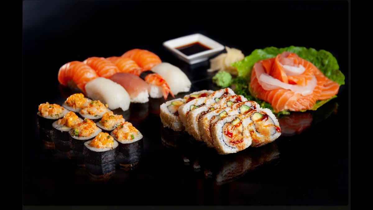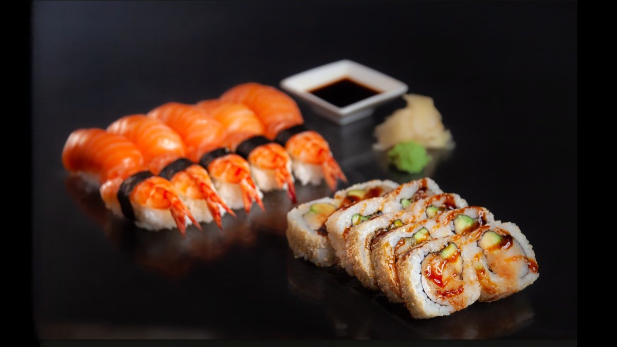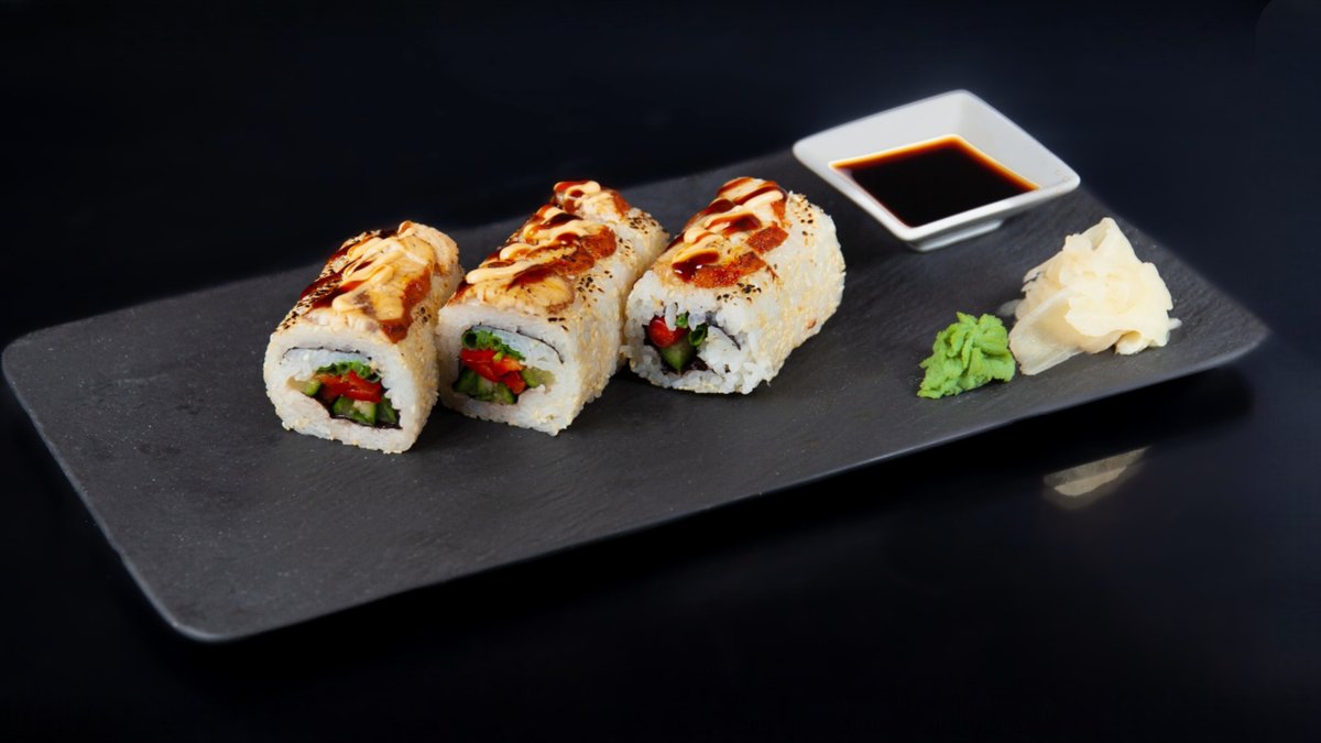 Laks, avokado, philadelphiaost, fritert scampi. Toppes med chilimajones og teriyakisaus.