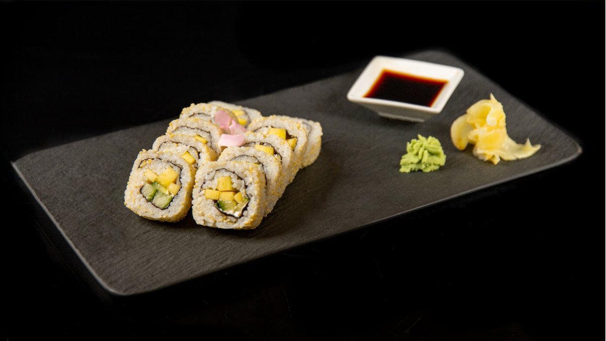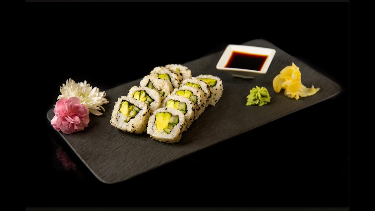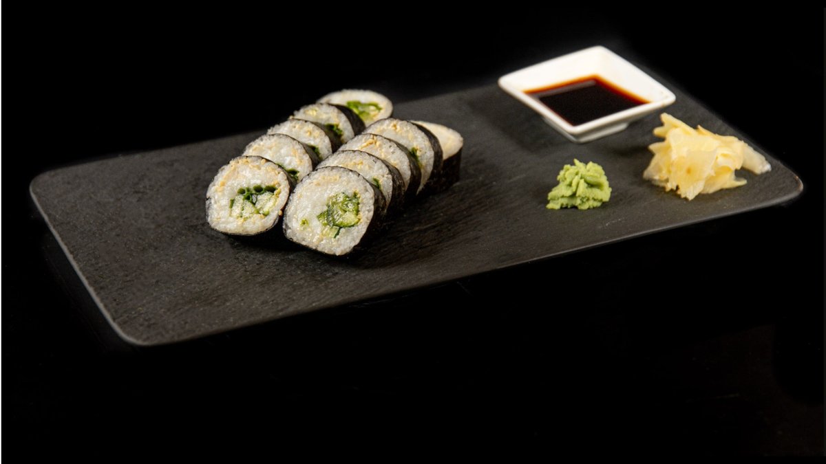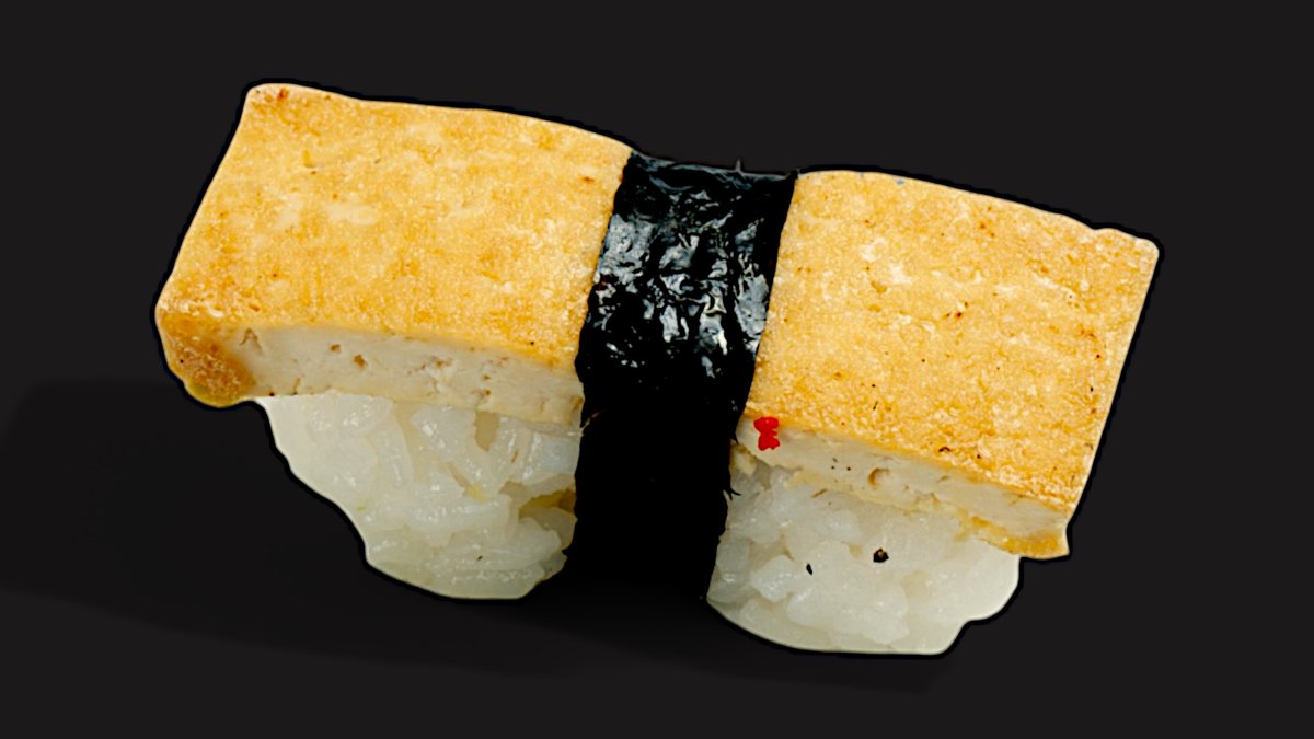 Tofu, avokado, gressløk, mozzarella. Toppet med aiolimajones og teriyakisaus.