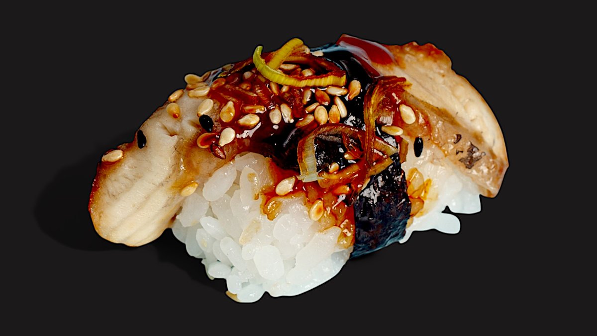 Marinert ål, agurk, gressløk, paprika og teriyakisaus.
