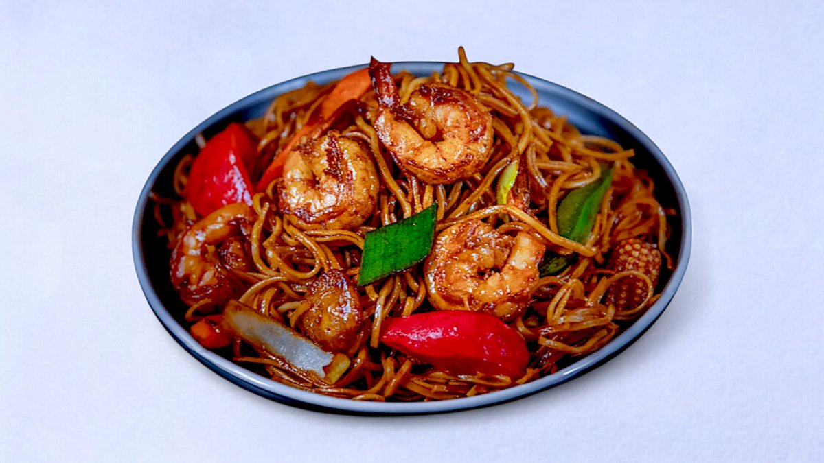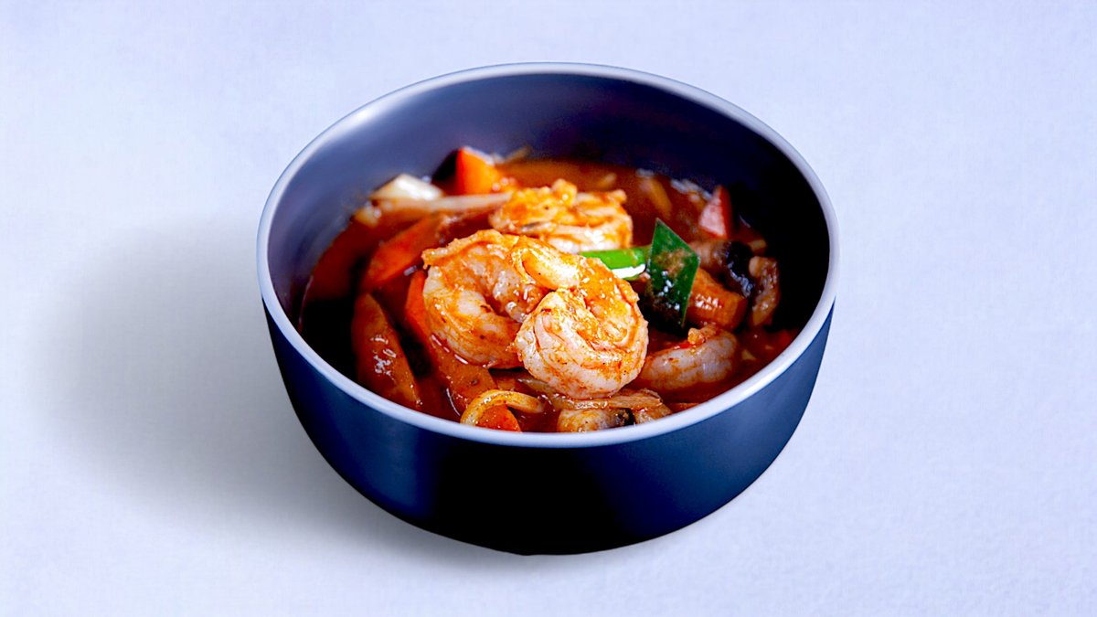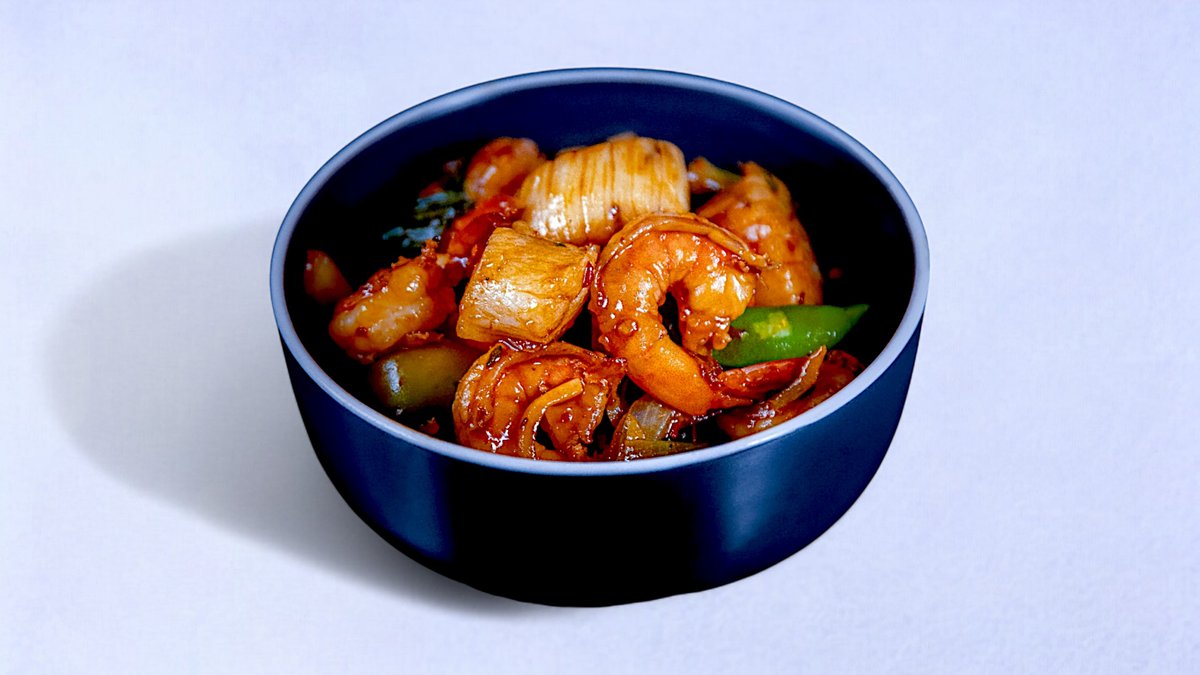 Serveres med scampi, kamskjell, kylling, grønnsaker og chilisaus.