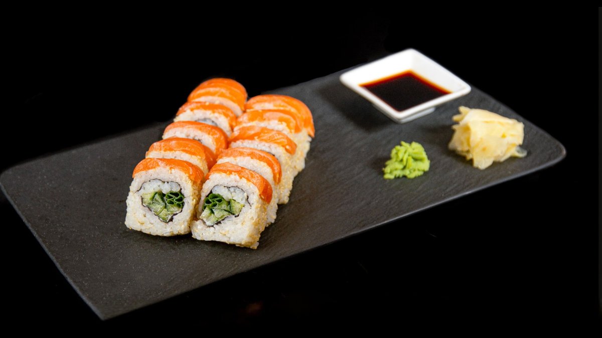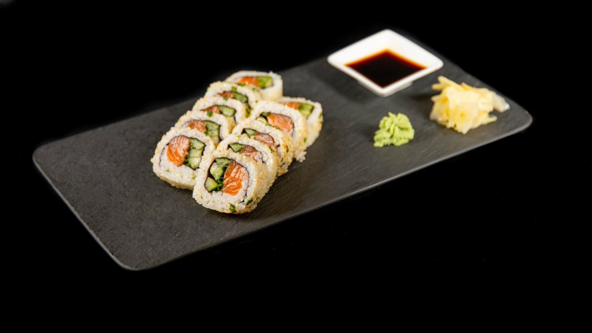 Rullet agurk, gressløk og philadelphiaost. Toppes med laks og teriyakisaus.