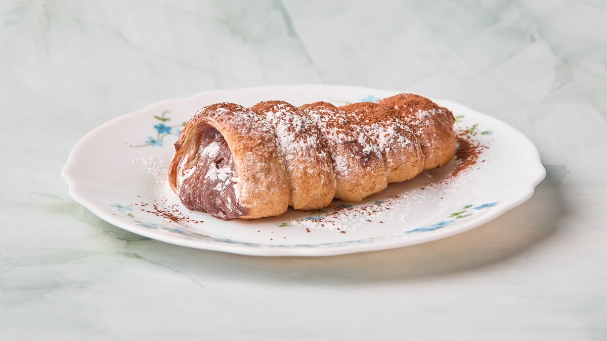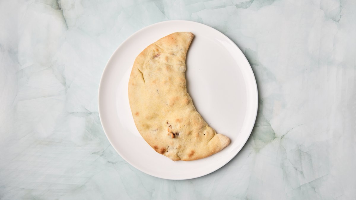 Pizza calzone, mozzarella, skinke, sjampinjonger, tomatsaus og oliven.
