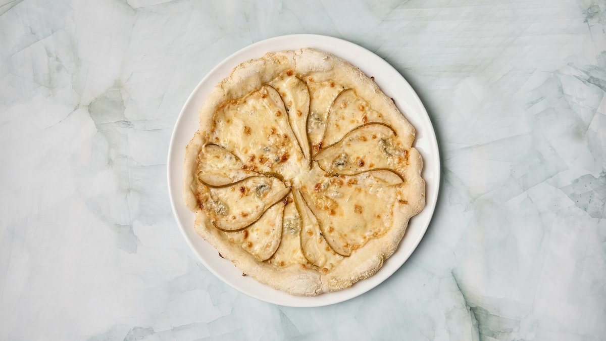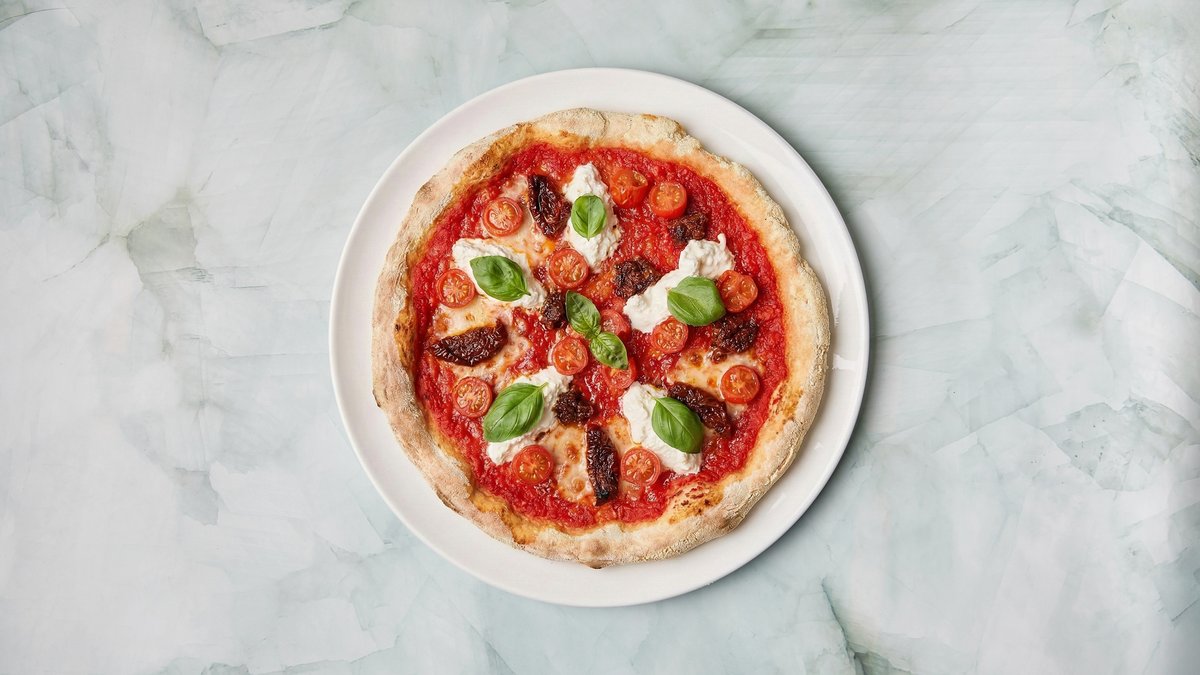 Tomatsaus, mozzarella, fersk basilikum og parmesan.