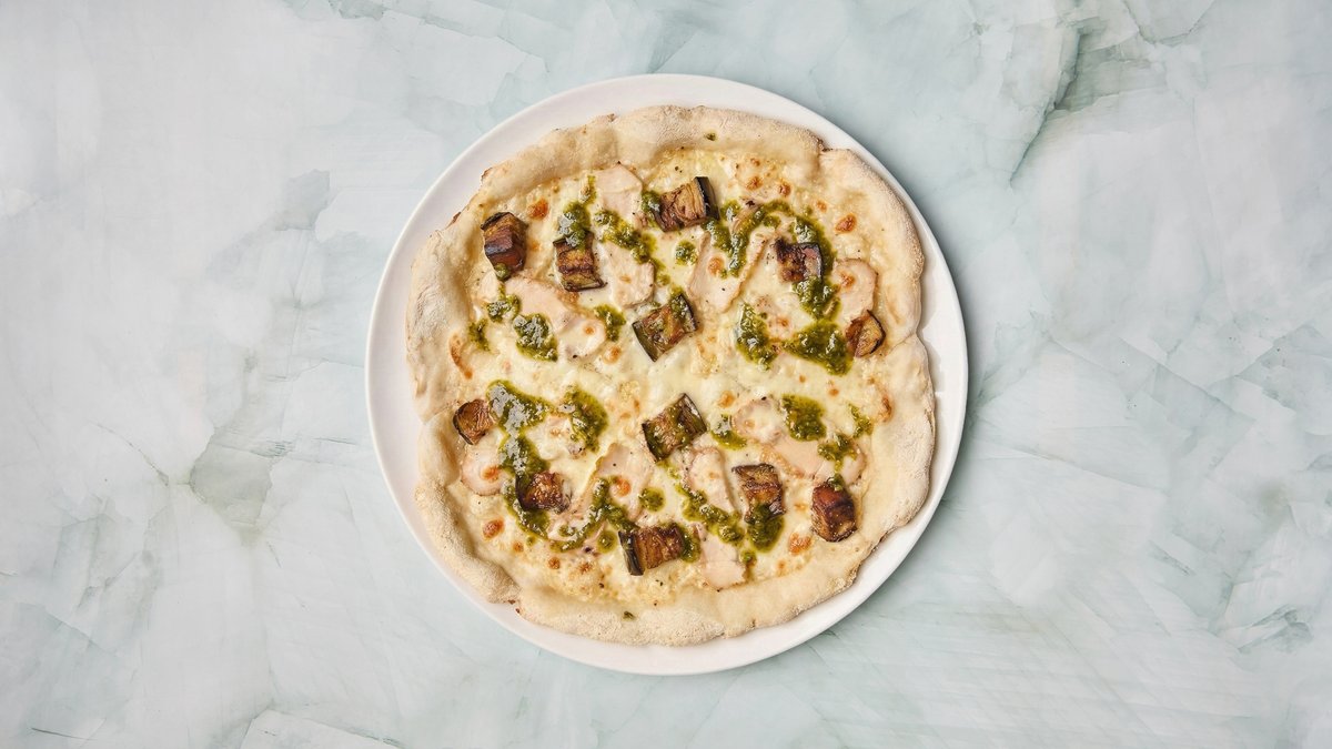 Crème fraiche, mozzarella, kylling, auberginer og pesto.