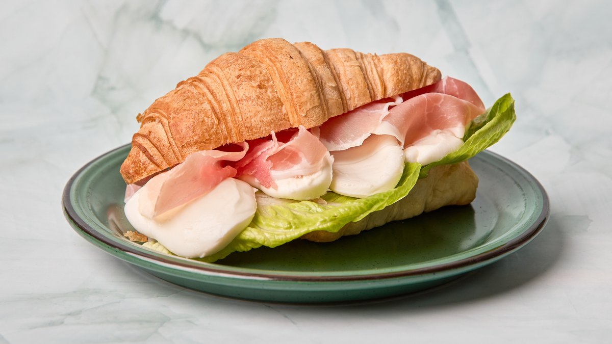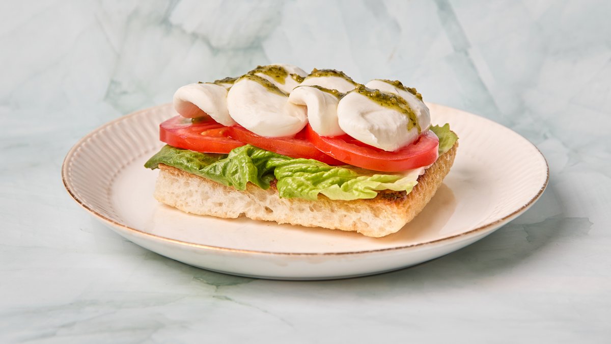 Fersk focacciabrød med mozzarella, pesto, salat og tomat.