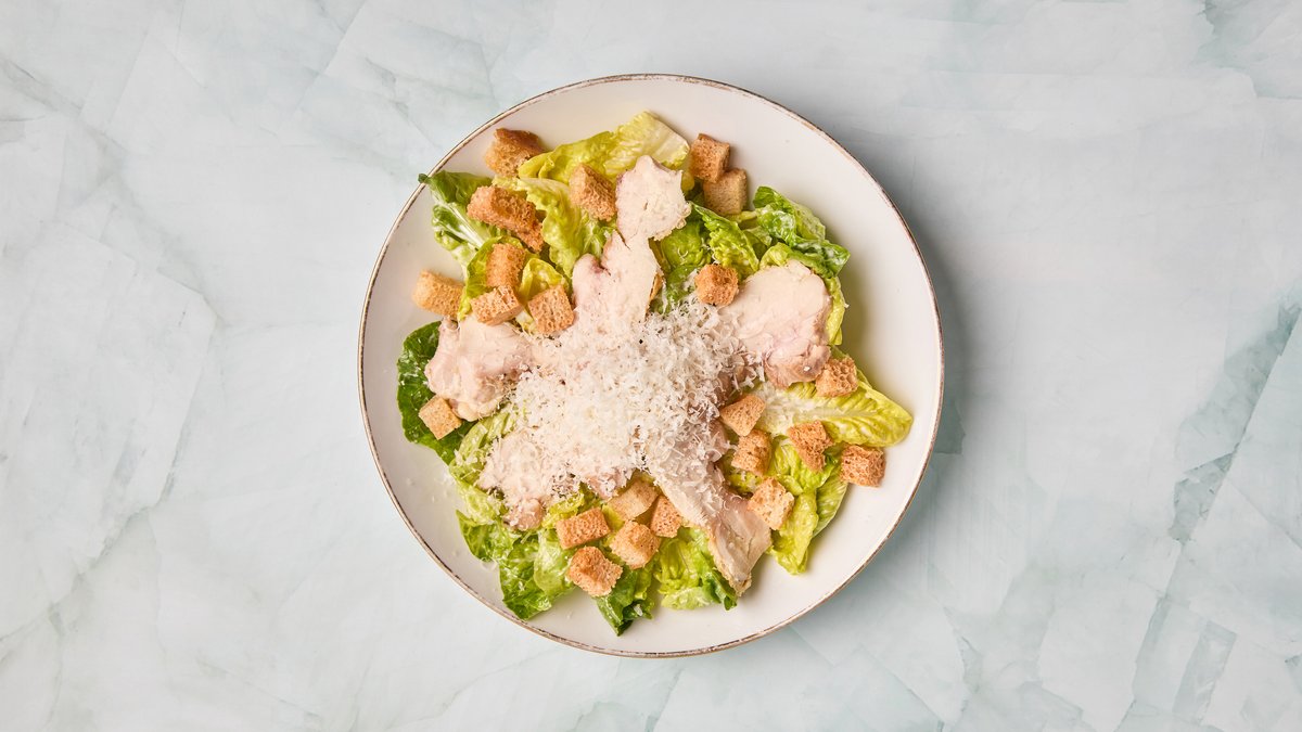 Kylling, hjertesalat, parmesan, parmesan majones og croutonger.