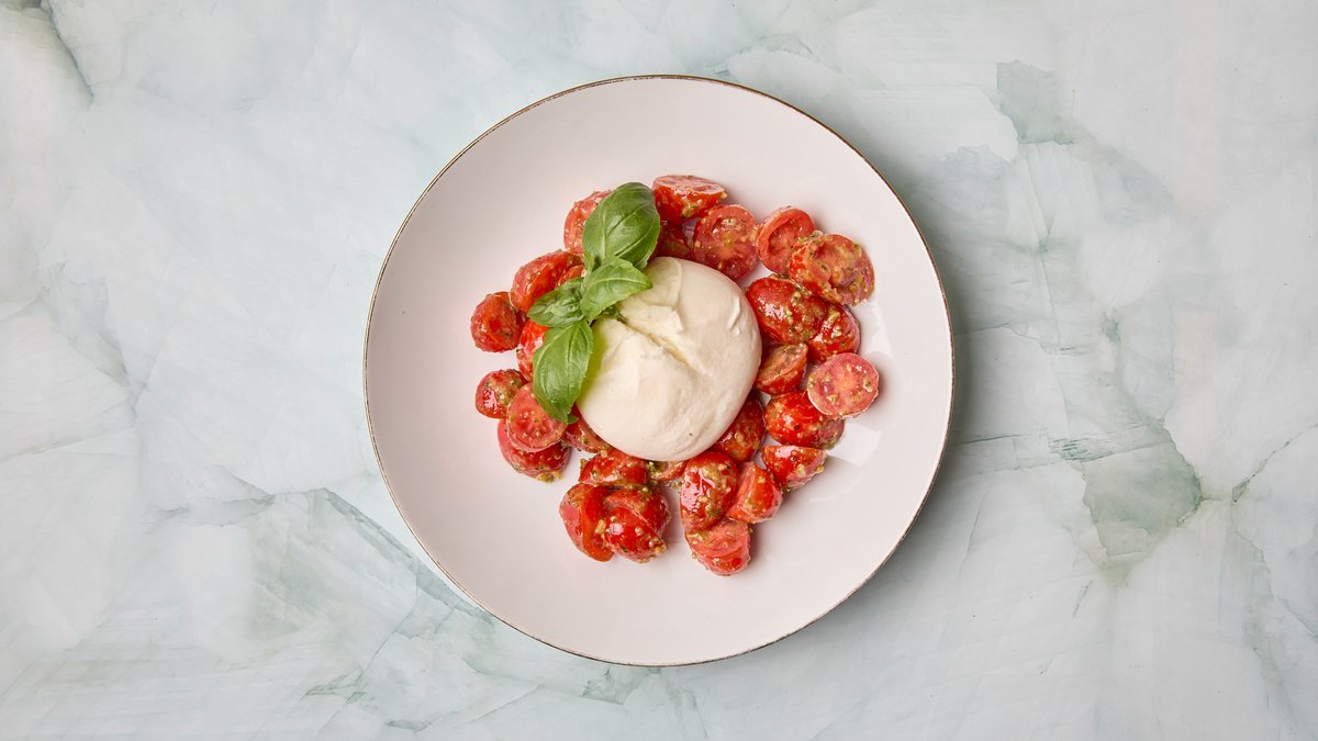 Tomatsaus, burrata, n'duja og cherrytomater.