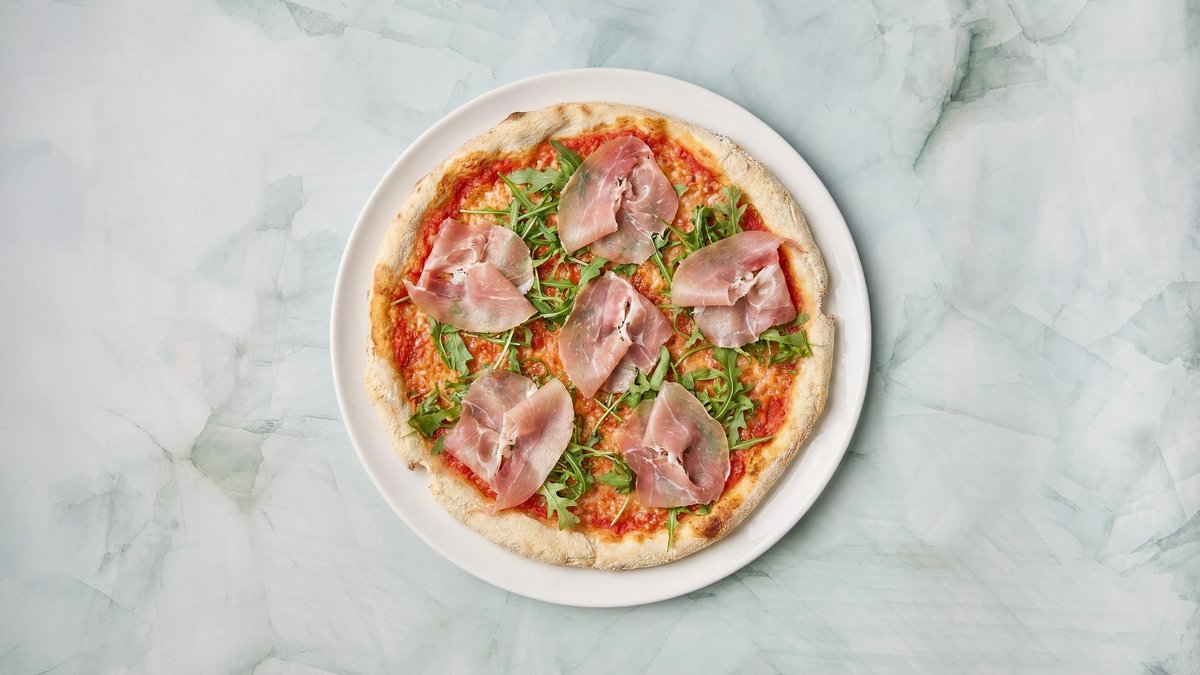 Tomatsaus, mozzarella, fersk basilikum, parma skinke og ruccola.