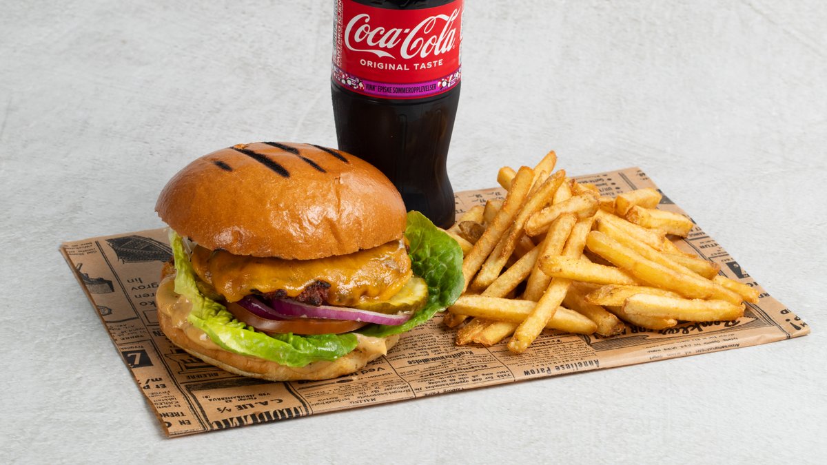 Storfeburger med fries og valgfri 0,5l drikke. Med fyr dressing, salat, bifftomat, rødløk, syltet agurk og cheddar.