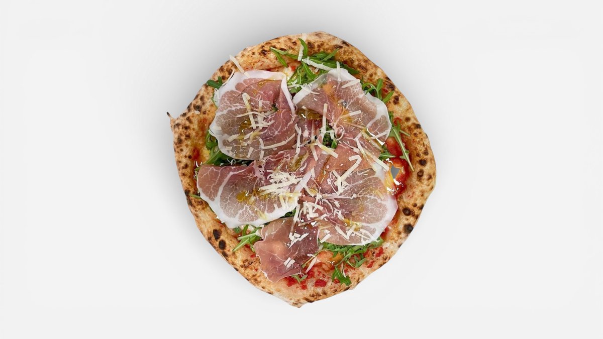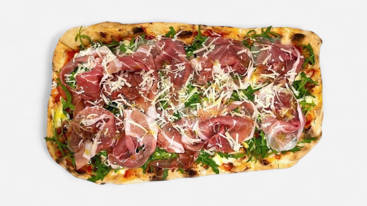 Tomatsaus, mozzarella, parmaskinke, parmigiano, ruccola og olivenolje