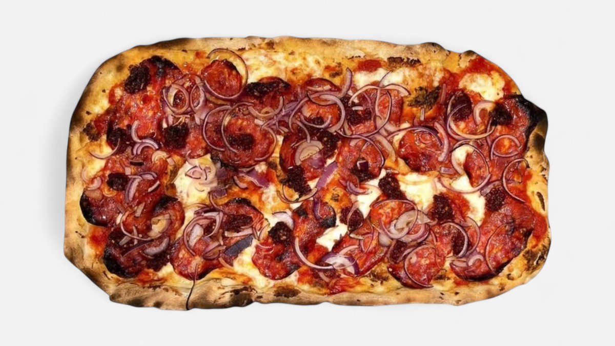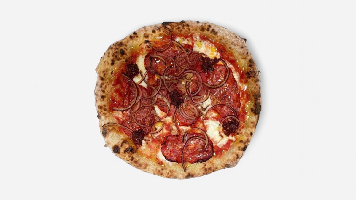 Tomatsaus, mozzarella, ‘nduja, spianata og løk