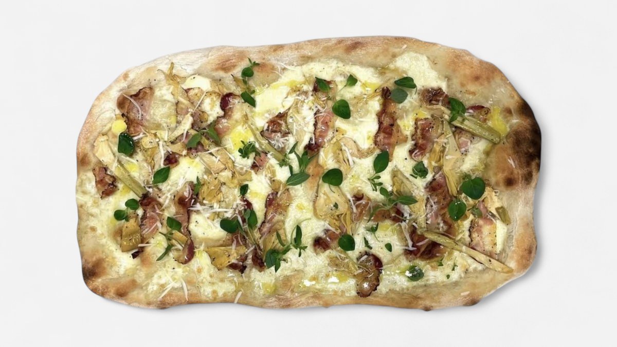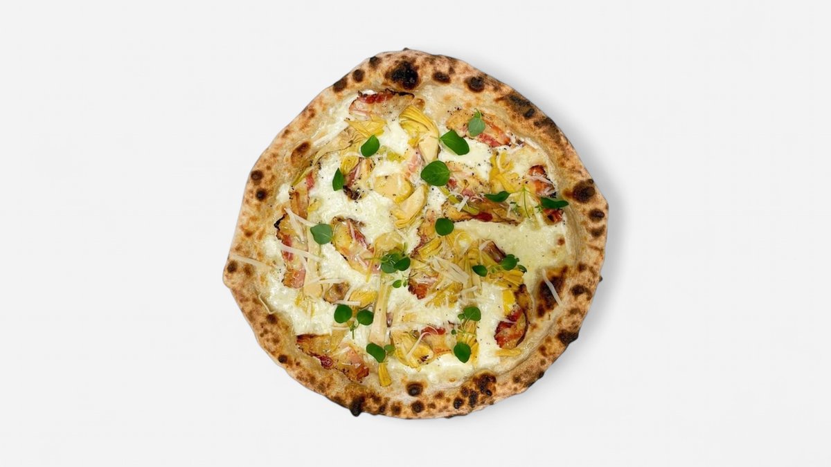 Mozzarella, guanciale, artisjokker, pecorino og fersk oregano