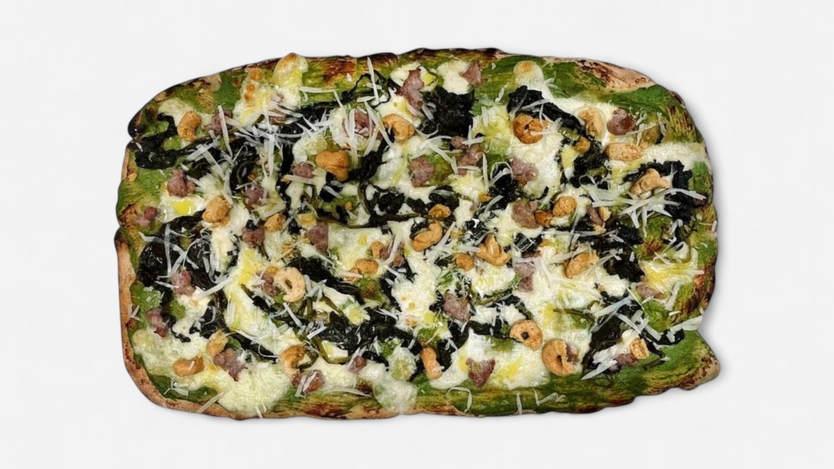 Brokkolikrem, mozzarella, salsiccia, brokkolirabe, pecorino og tarallo (salt kjeks)
